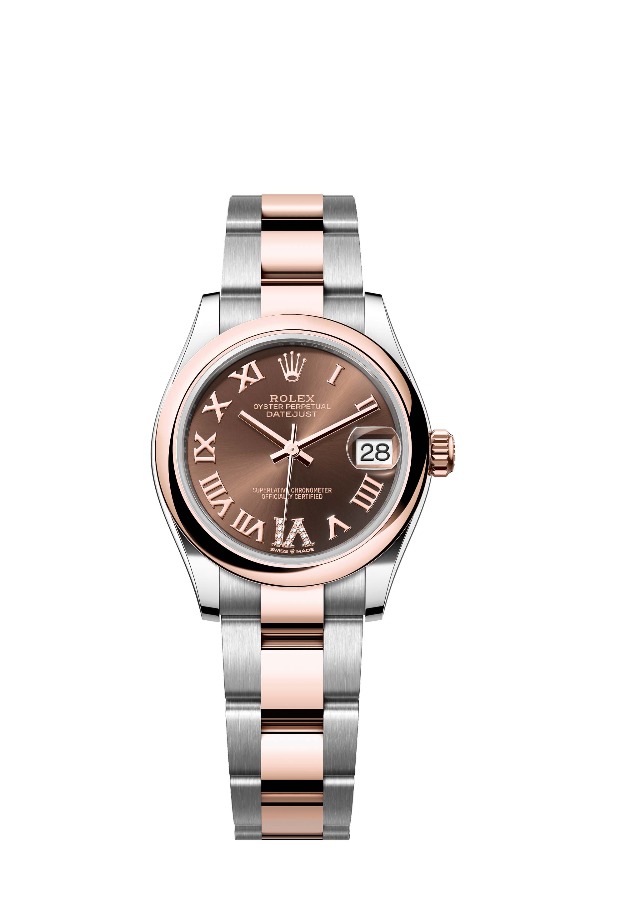 This Oyster Perpetual Datejust 31 in Oystersteel and Everose gold features a chocolate, diamond-set dial and an Oyster bracelet.