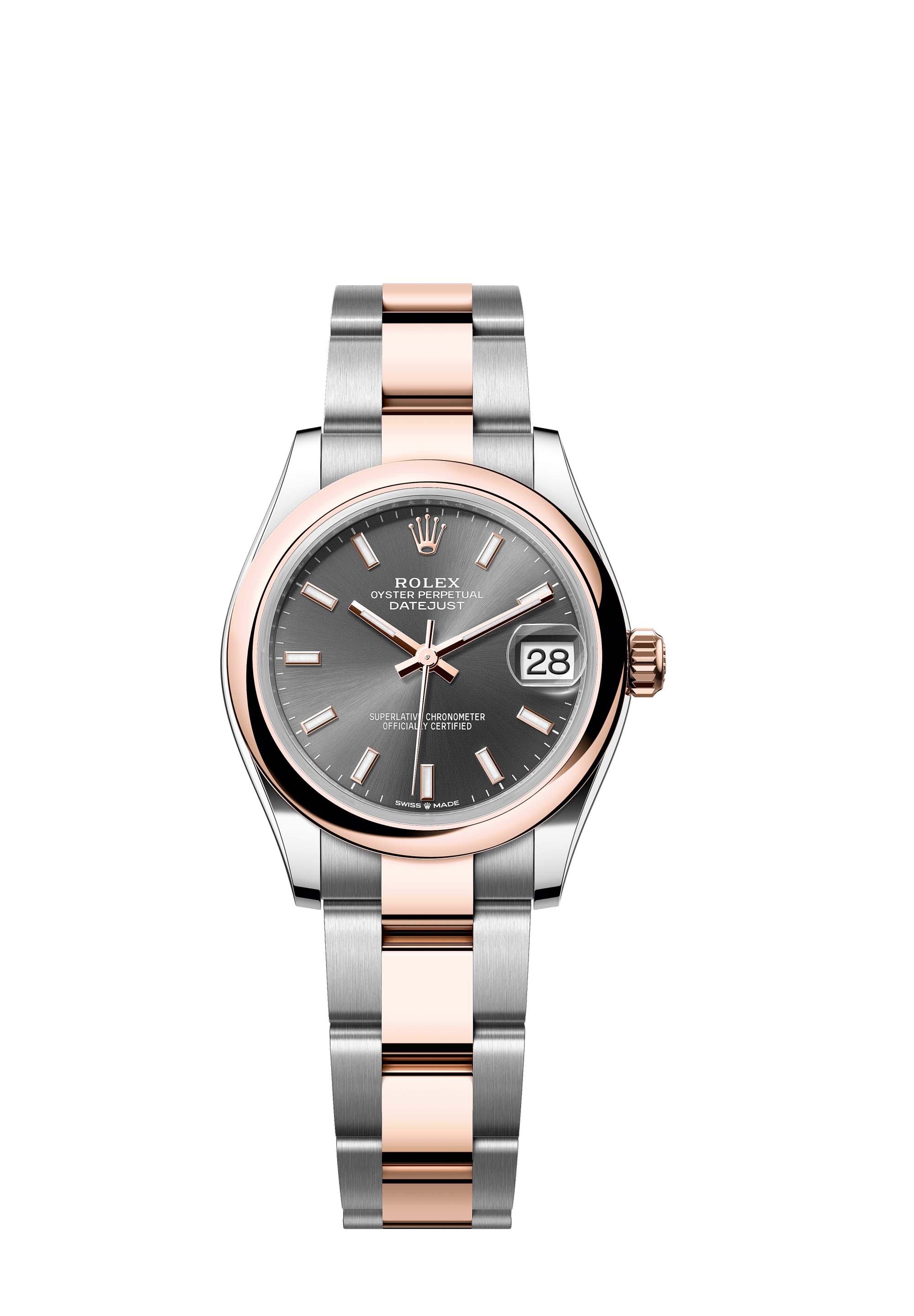 This Oyster Perpetual Datejust 31 in Oystersteel and Everose gold features a slate dial and an Oyster bracelet.
