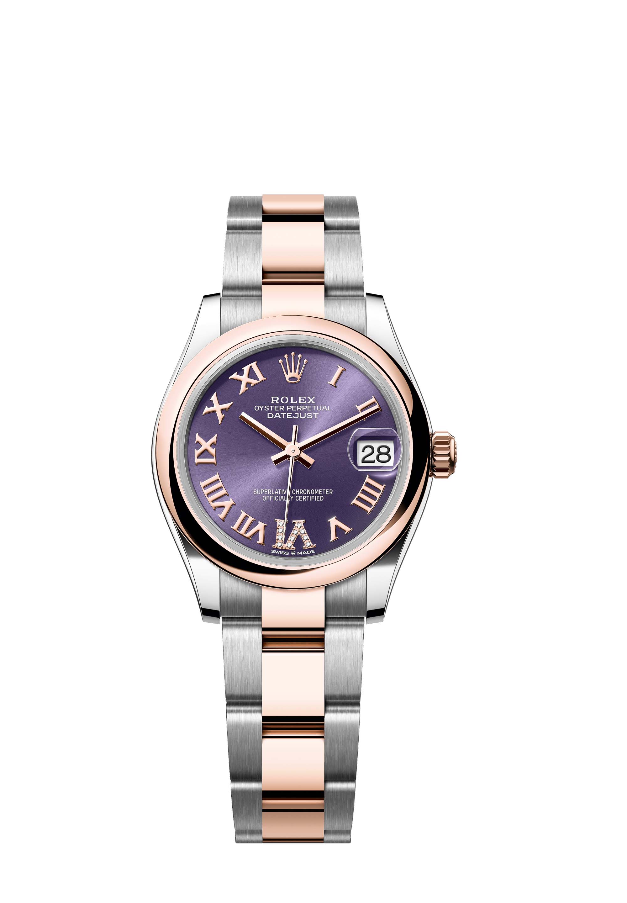 This Oyster Perpetual Datejust 31 in Oystersteel and Everose gold features an aubergine, diamond-set dial and an Oyster bracelet.