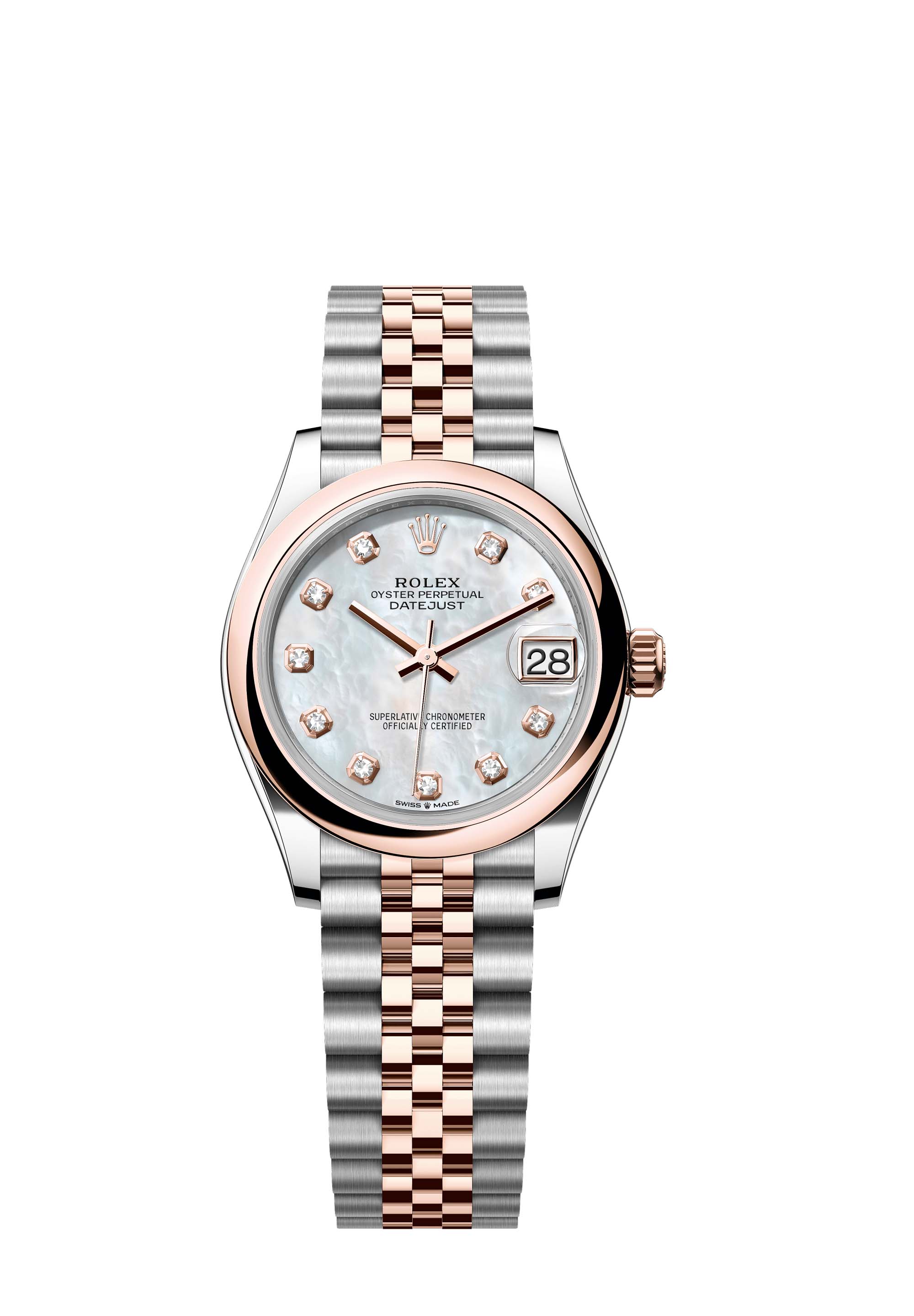 This Oyster Perpetual Datejust 31 in Oystersteel and Everose gold features a white mother-of-pearl, diamond-set dial and a Jubilee bracelet.