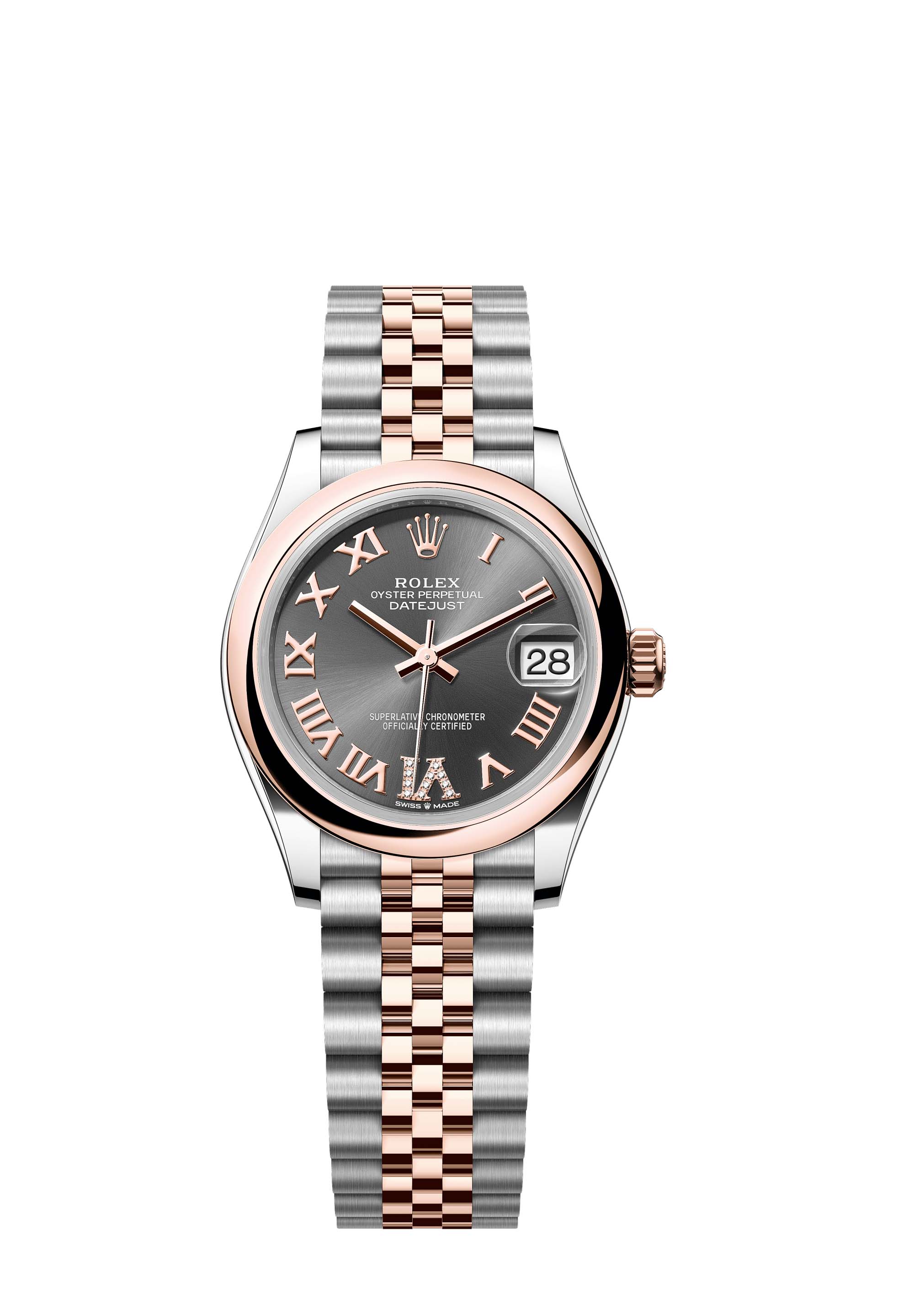 This Oyster Perpetual Datejust 31 in Oystersteel and Everose gold features a slate, diamond-set dial and a Jubilee bracelet.