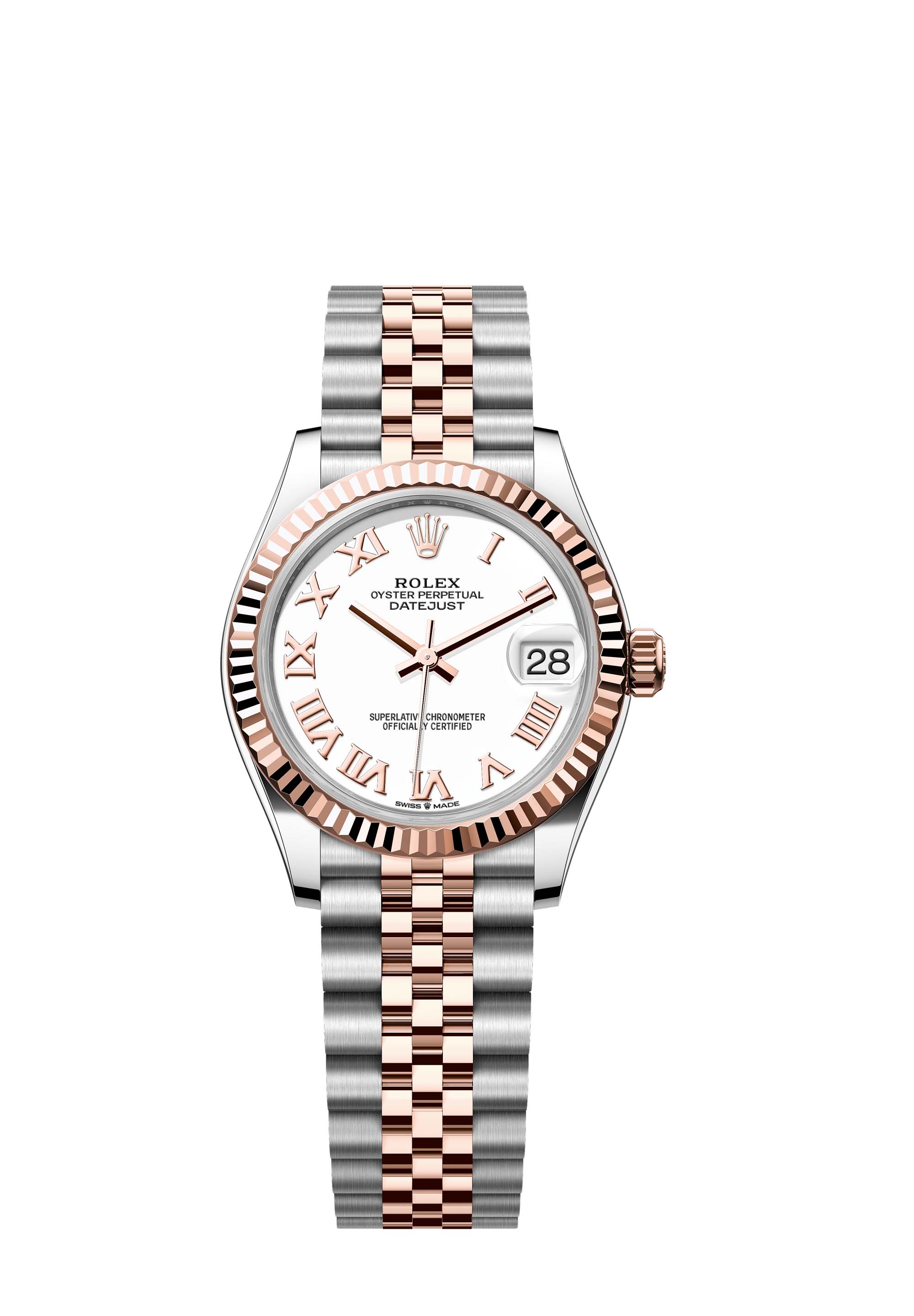 This Oyster Perpetual Datejust 31 in Oystersteel and Everose gold features a white dial and a Jubilee bracelet.