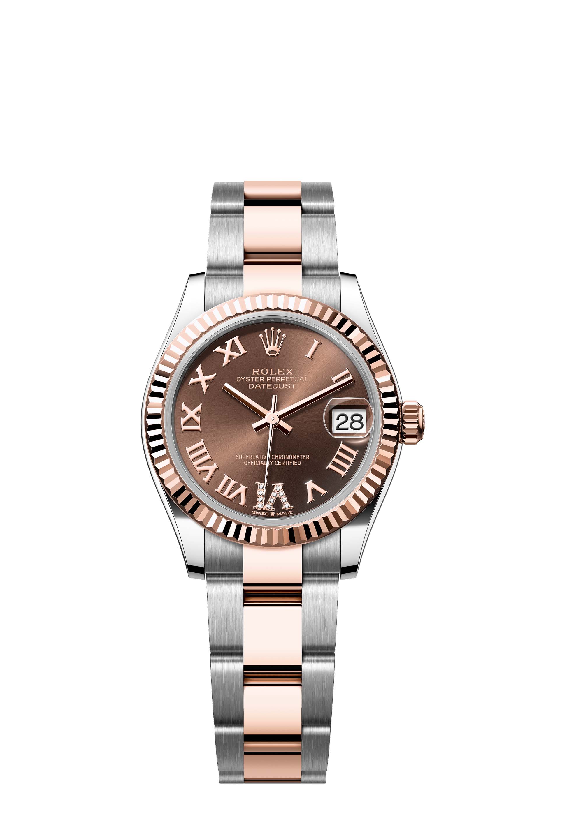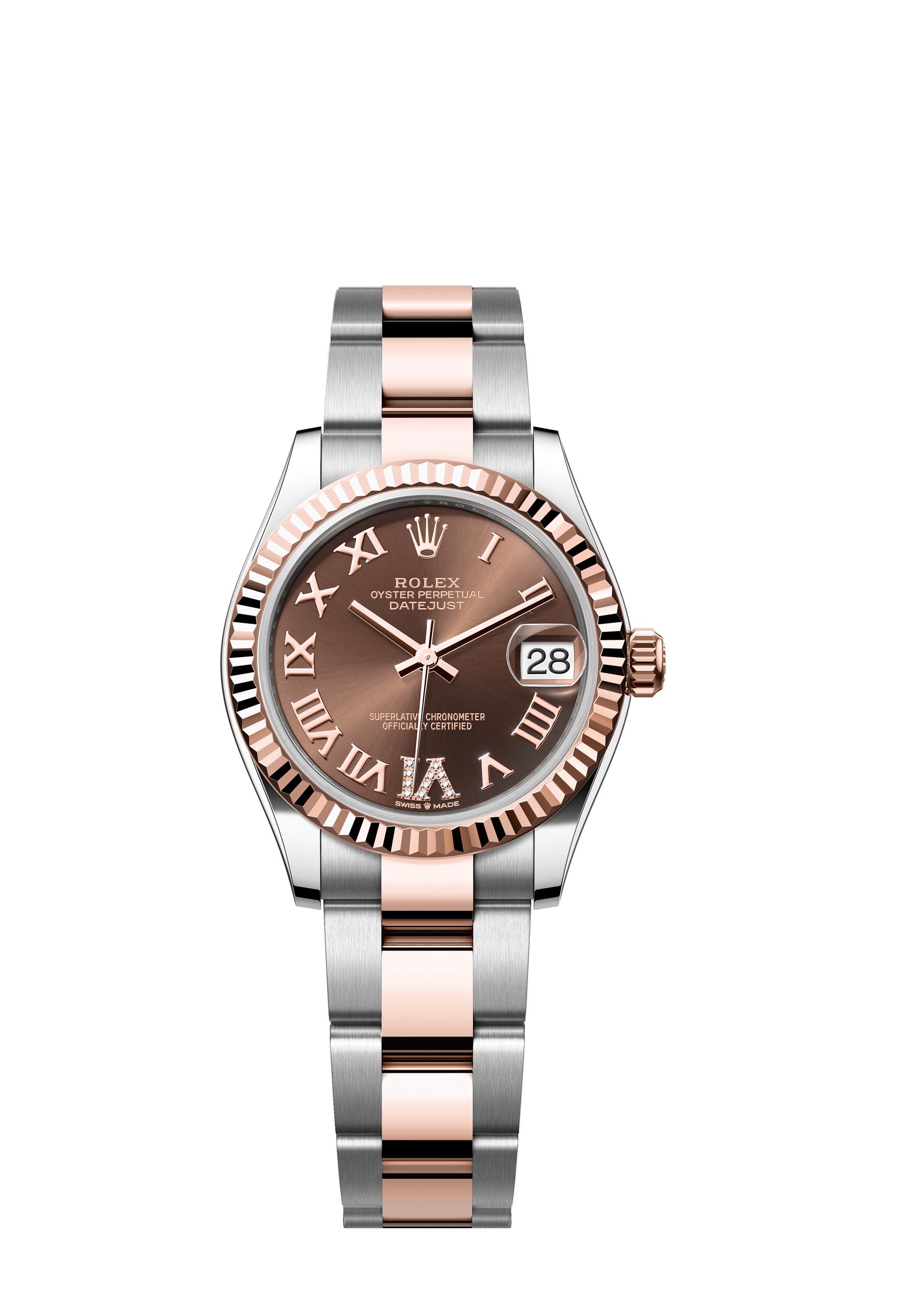 This Oyster Perpetual Datejust 31 in Oystersteel and Everose gold features a chocolate, diamond-set dial and an Oyster bracelet.