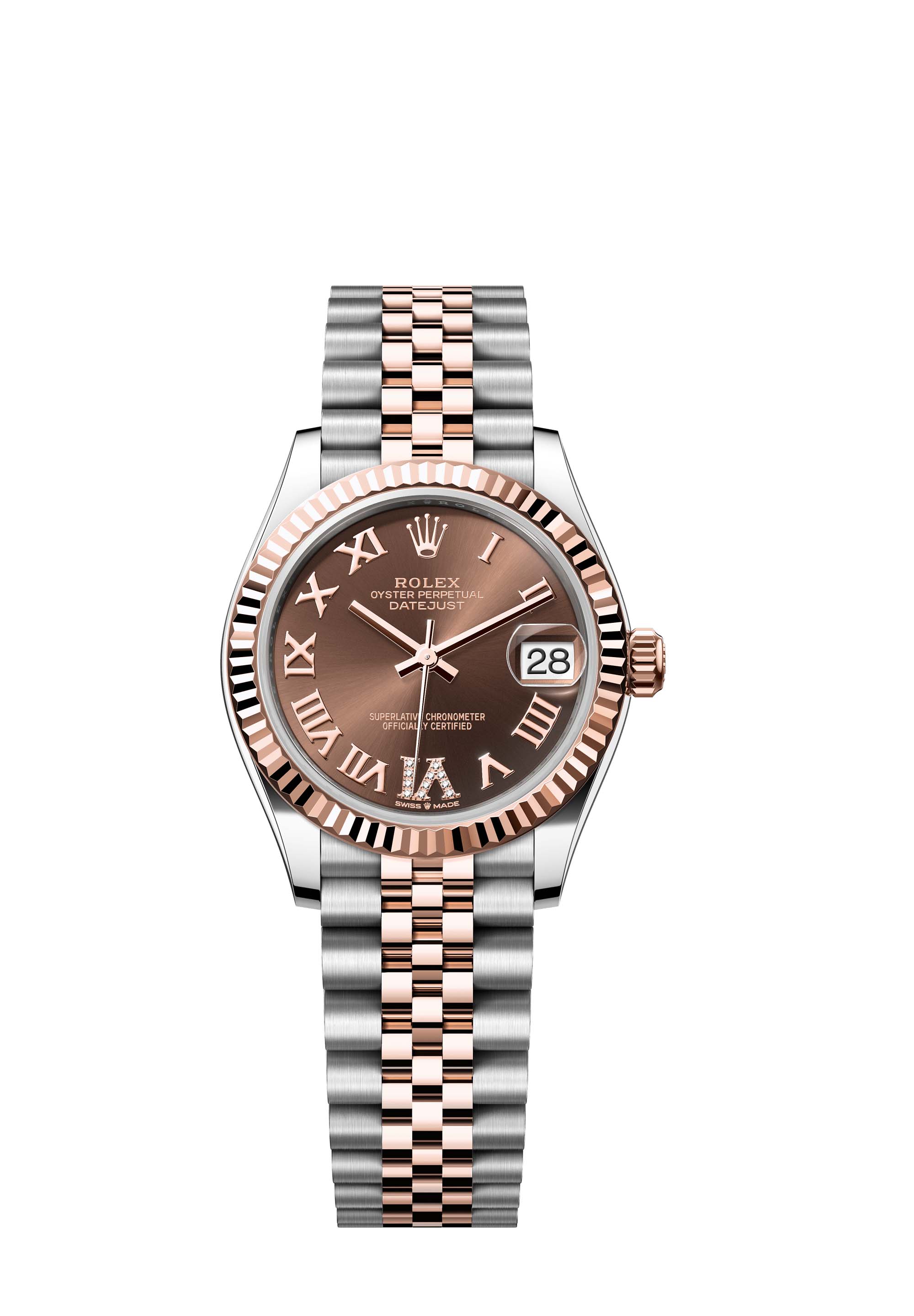 This Oyster Perpetual Datejust 31 in Oystersteel and Everose gold features a chocolate, diamond-set dial and a Jubilee bracelet.