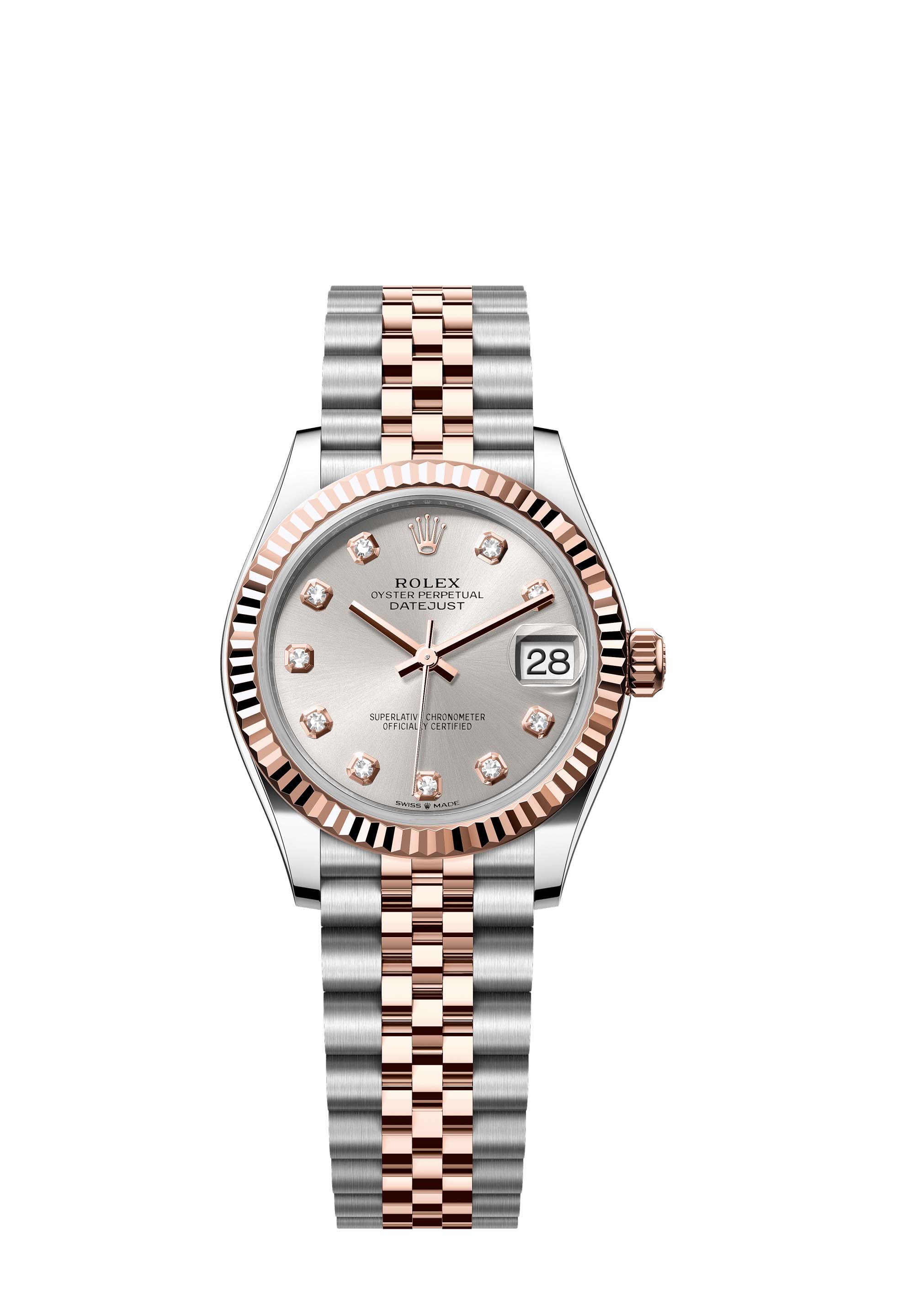 This Oyster Perpetual Datejust 31 in Oystersteel and Everose gold features a silver, diamond-set dial and a Jubilee bracelet.