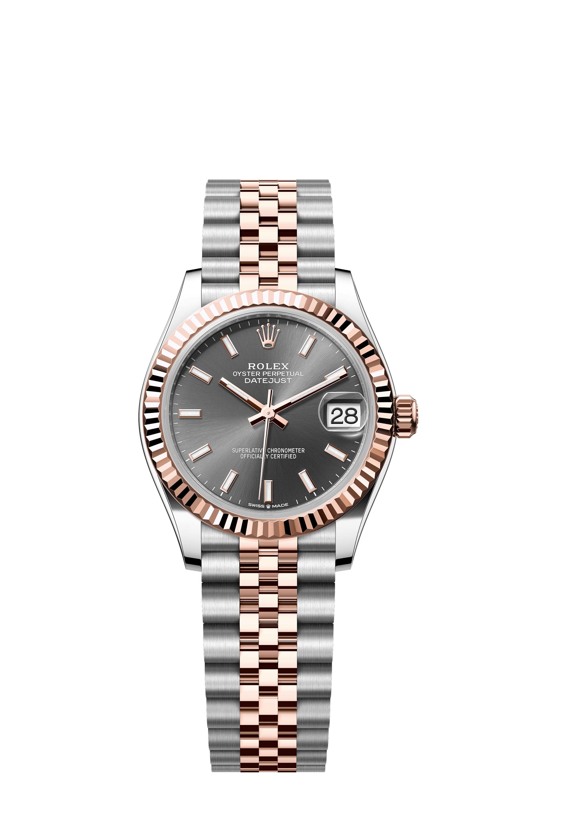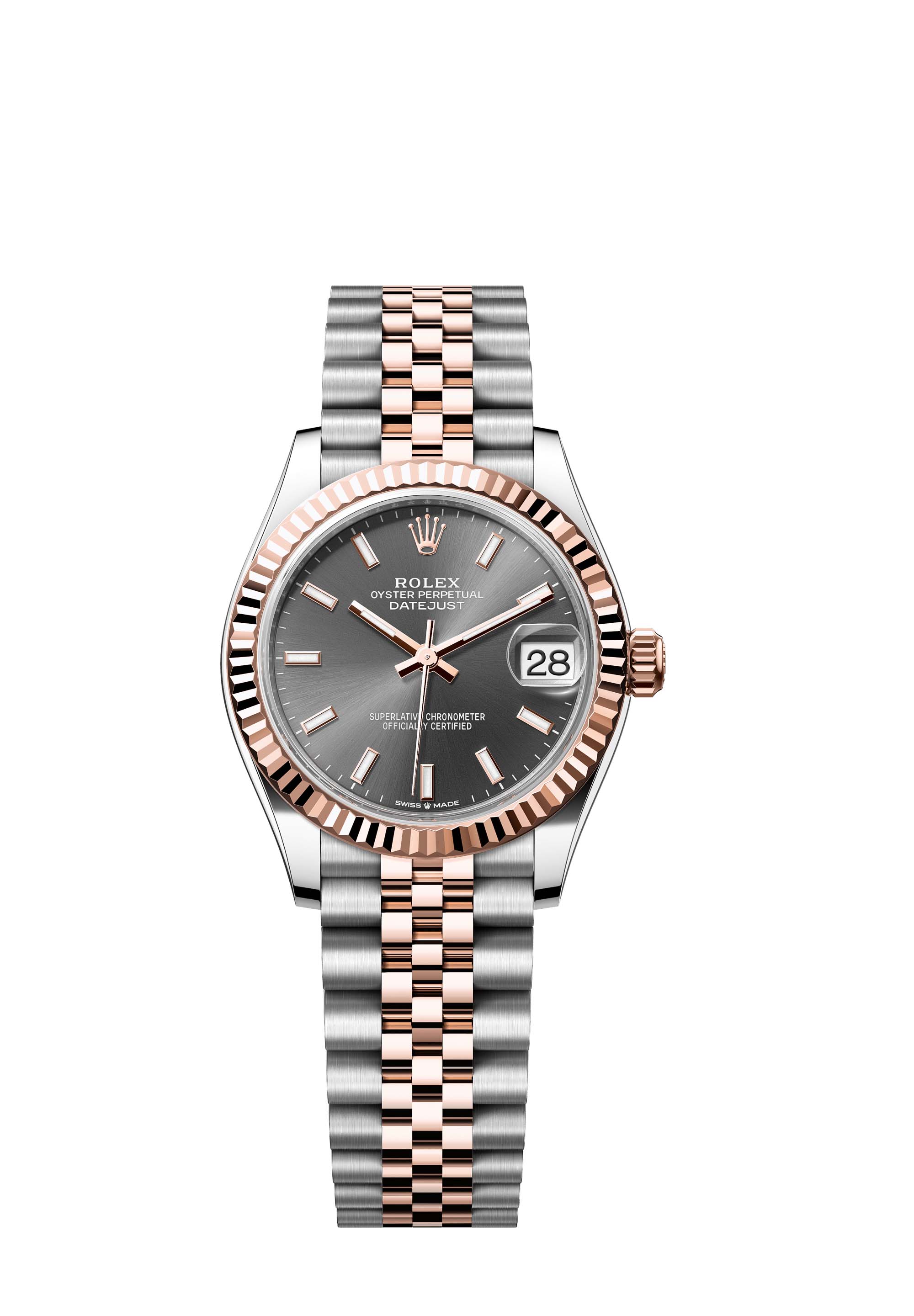 This Oyster Perpetual Datejust 31 in Oystersteel and Everose gold features a slate dial and a Jubilee bracelet.