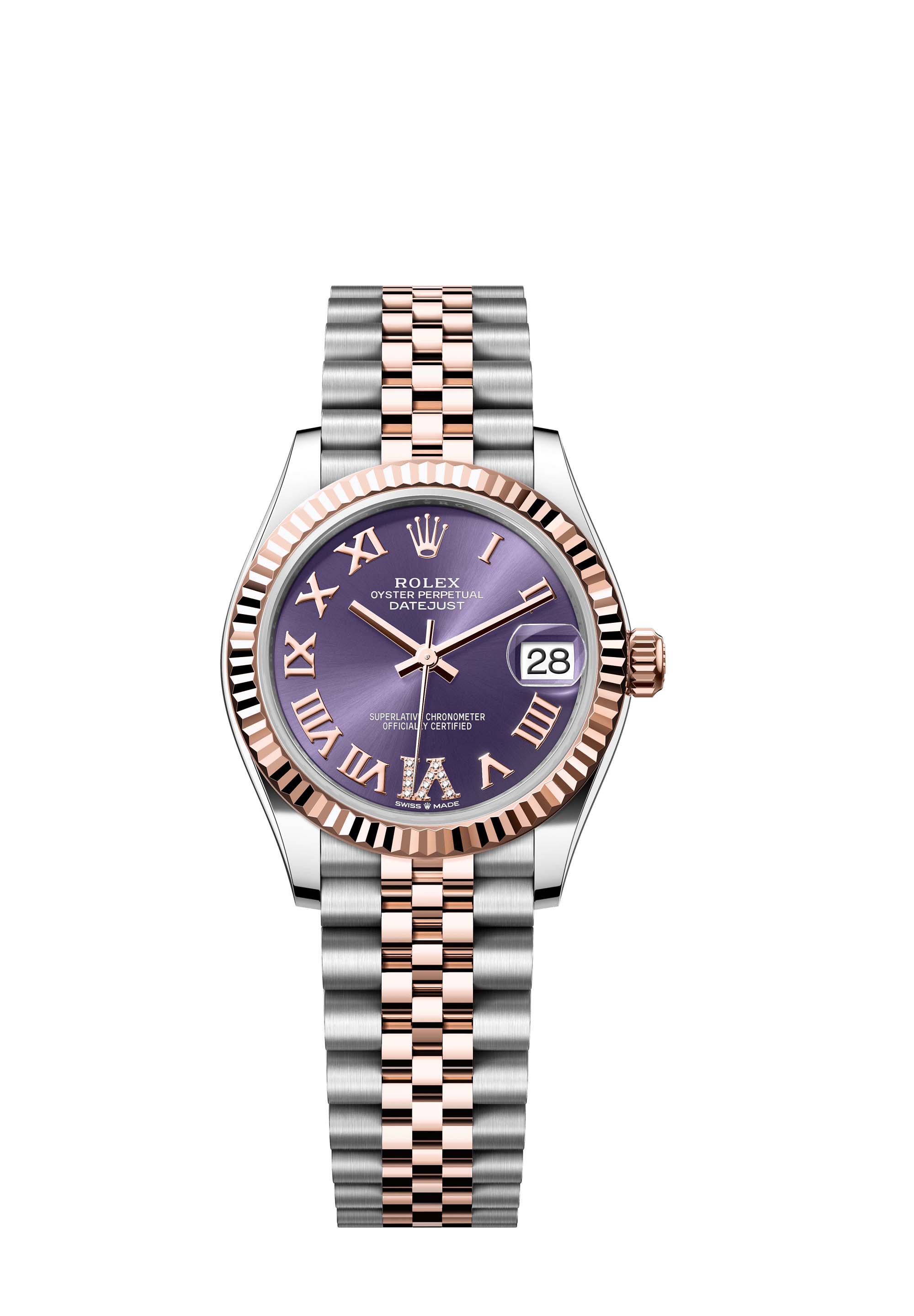 This Oyster Perpetual Datejust 31 in Oystersteel and Everose gold features an aubergine, diamond-set dial and a Jubilee bracelet.
