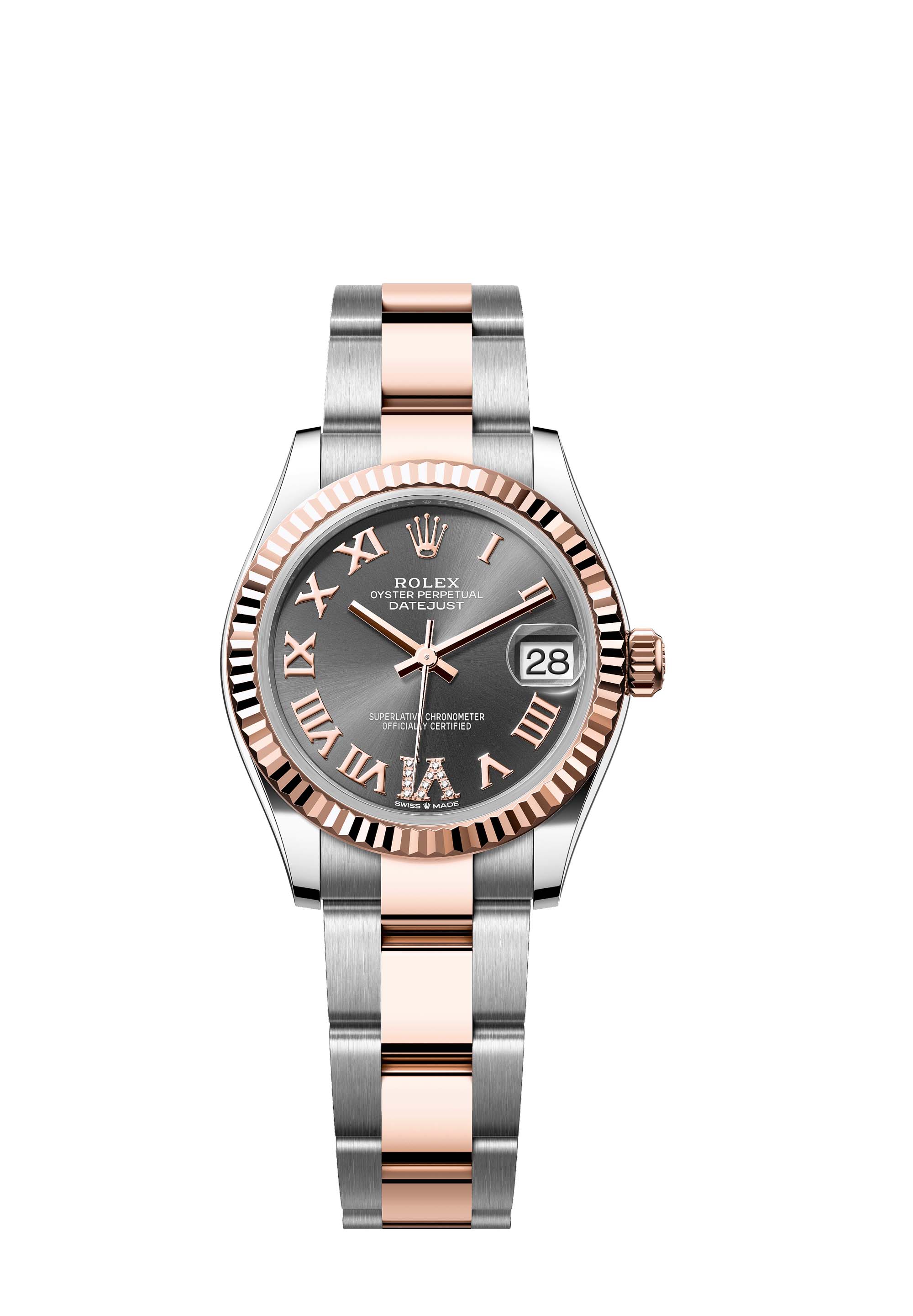 This Oyster Perpetual Datejust 31 in Oystersteel and Everose gold features a slate, diamond-set dial and an Oyster bracelet.