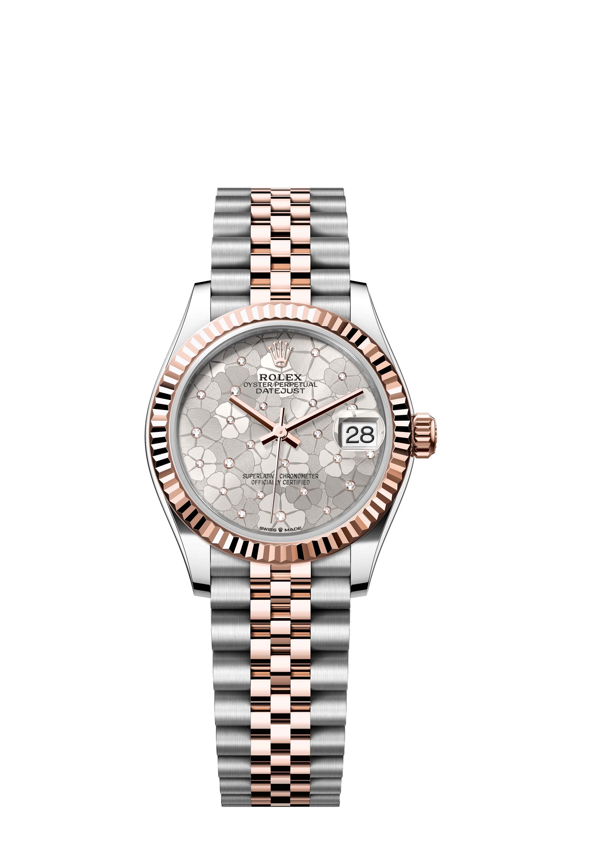 This Oyster Perpetual Datejust 31 in Oystersteel and Everose gold features a silver floral-motif, diamond-set dial and a Jubilee bracelet.
