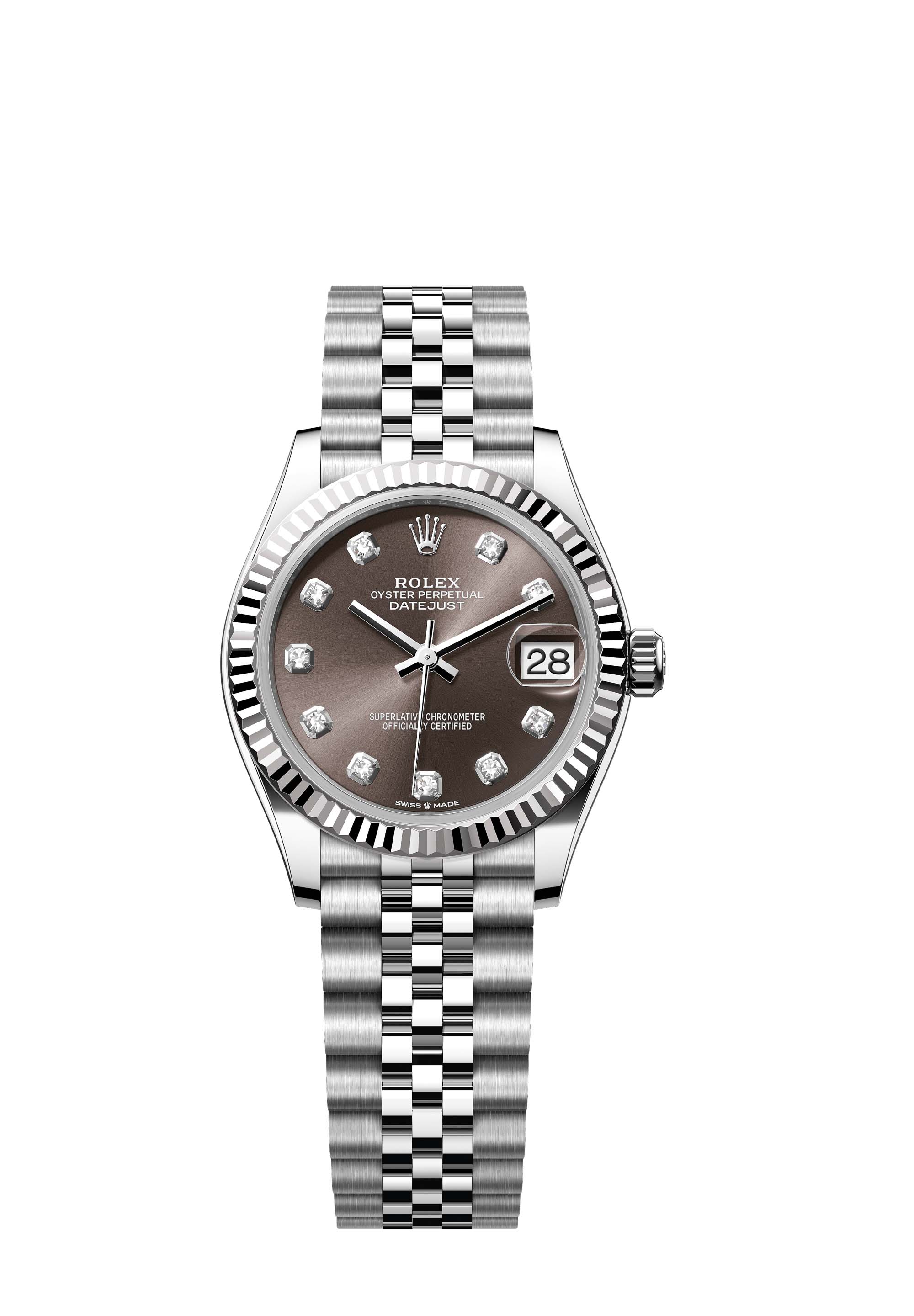 This Oyster Perpetual Datejust 31 in Oystersteel and white gold features a dark grey, diamond-set dial and a Jubilee bracelet.