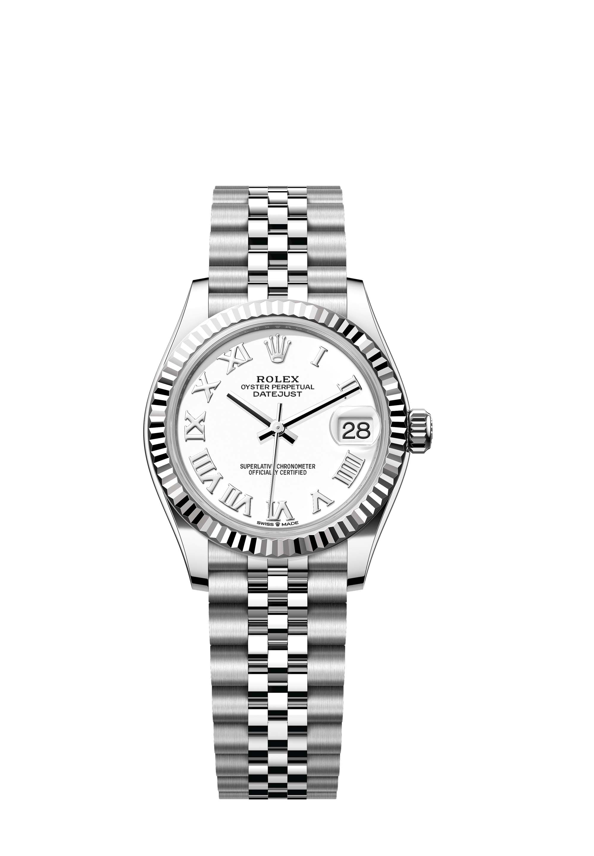 This Oyster Perpetual Datejust 31 in Oystersteel and white gold features a white dial and a Jubilee bracelet.