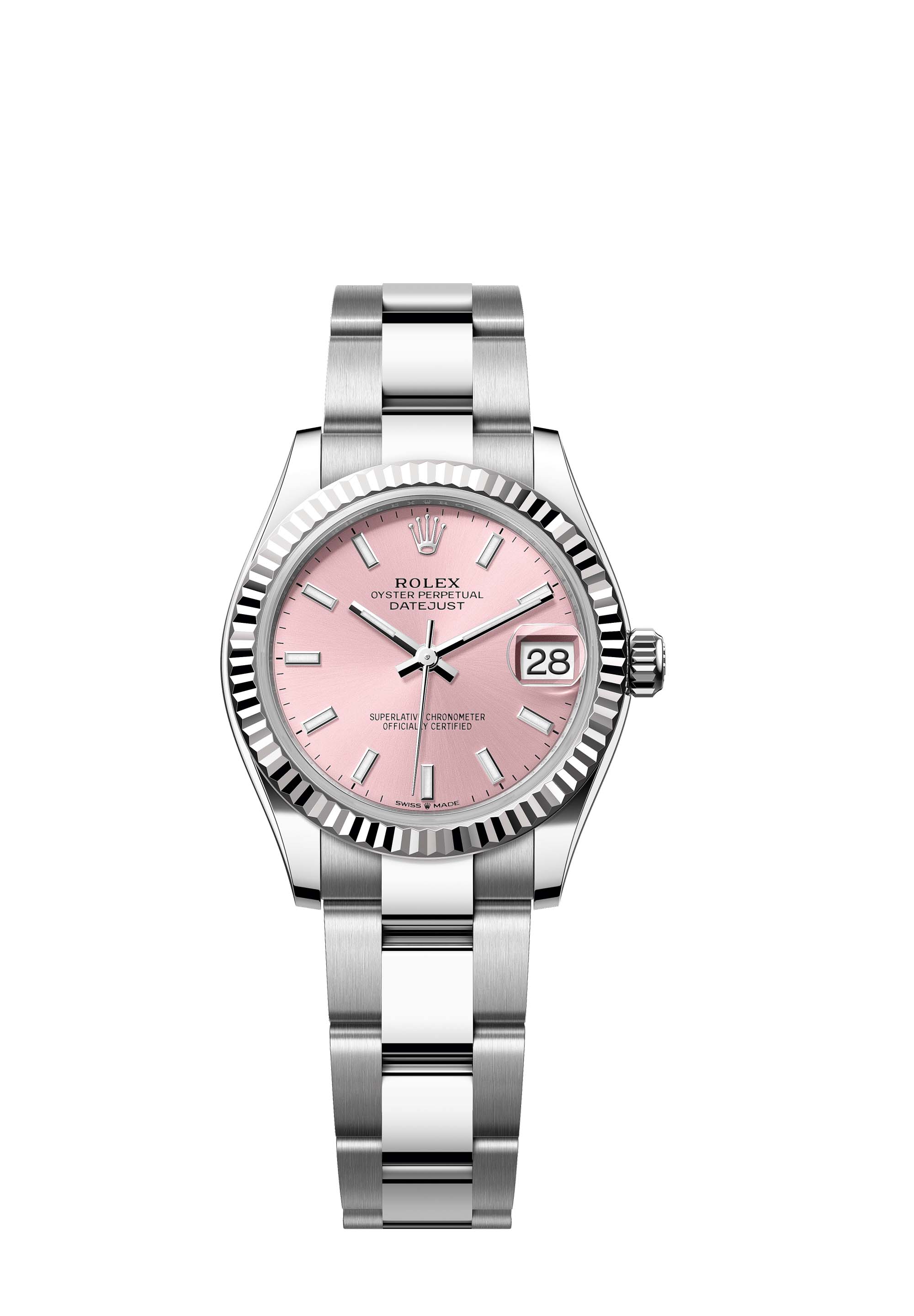 This Oyster Perpetual Datejust 31 in Oystersteel and white gold features a pink dial and an Oyster bracelet.