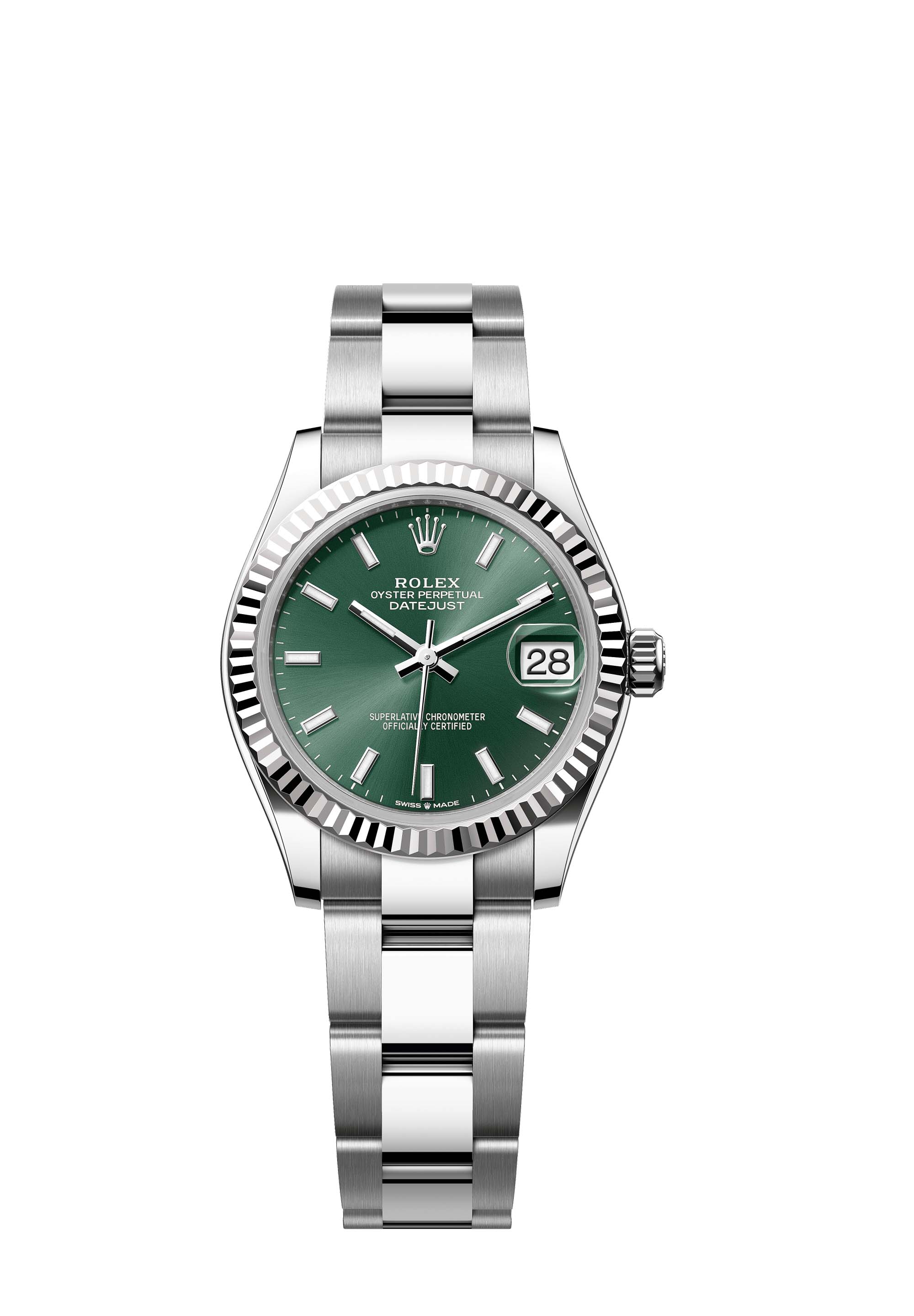 This Oyster Perpetual Datejust 31 in Oystersteel and white gold features a mint green dial and an Oyster bracelet.