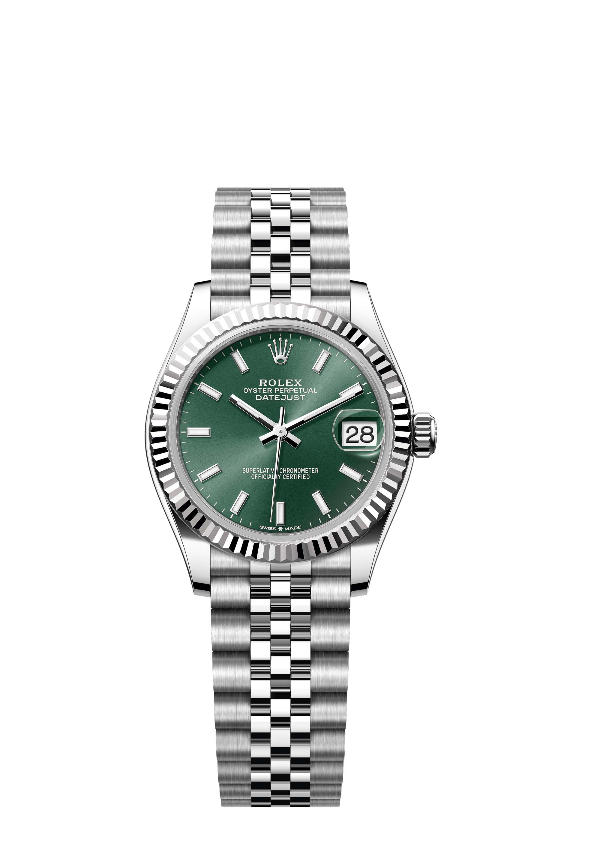 This Oyster Perpetual Datejust 31 in Oystersteel and white gold features a mint green dial and a Jubilee bracelet.