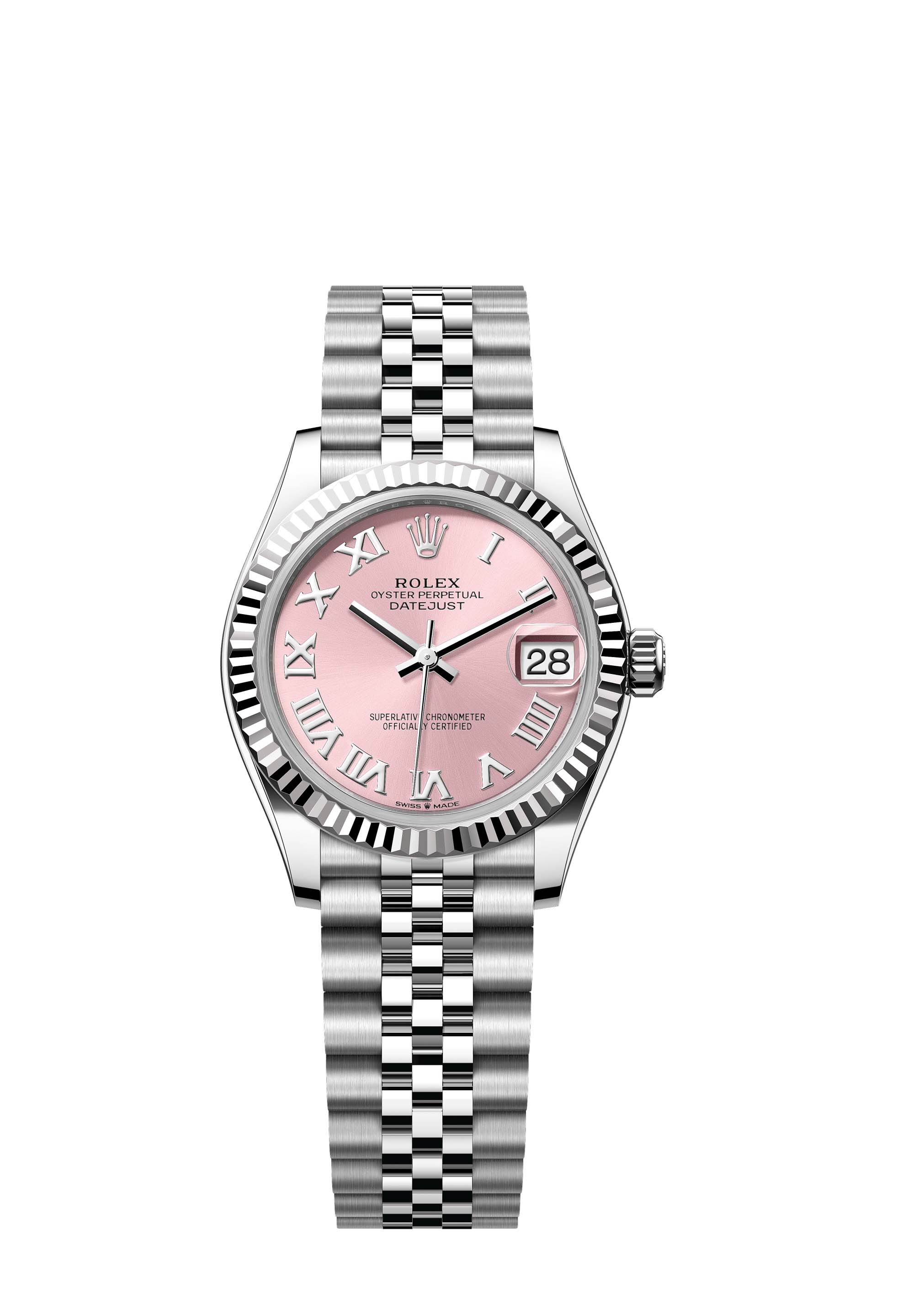 This Oyster Perpetual Datejust 31 in Oystersteel and white gold features a pink dial and a Jubilee bracelet.