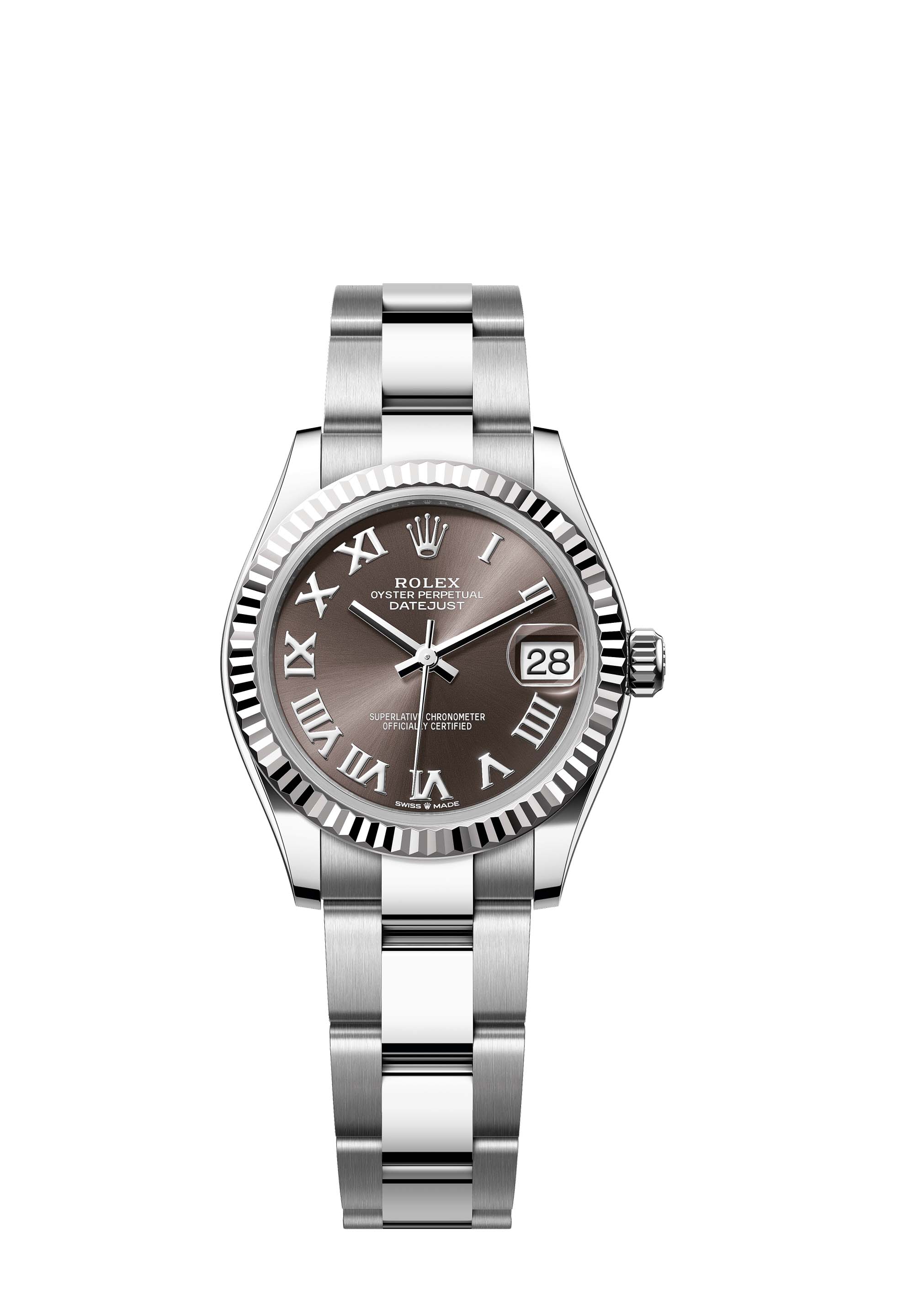 This Oyster Perpetual Datejust 31 in Oystersteel and white gold features a dark grey dial and an Oyster bracelet.