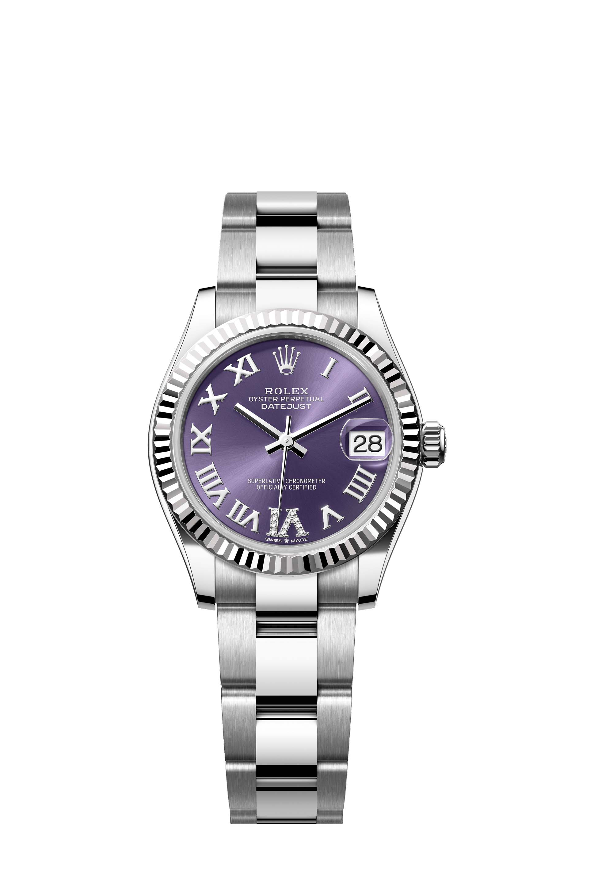 This Oyster Perpetual Datejust 31 in Oystersteel and white gold features an aubergine, diamond-set dial and an Oyster bracelet.