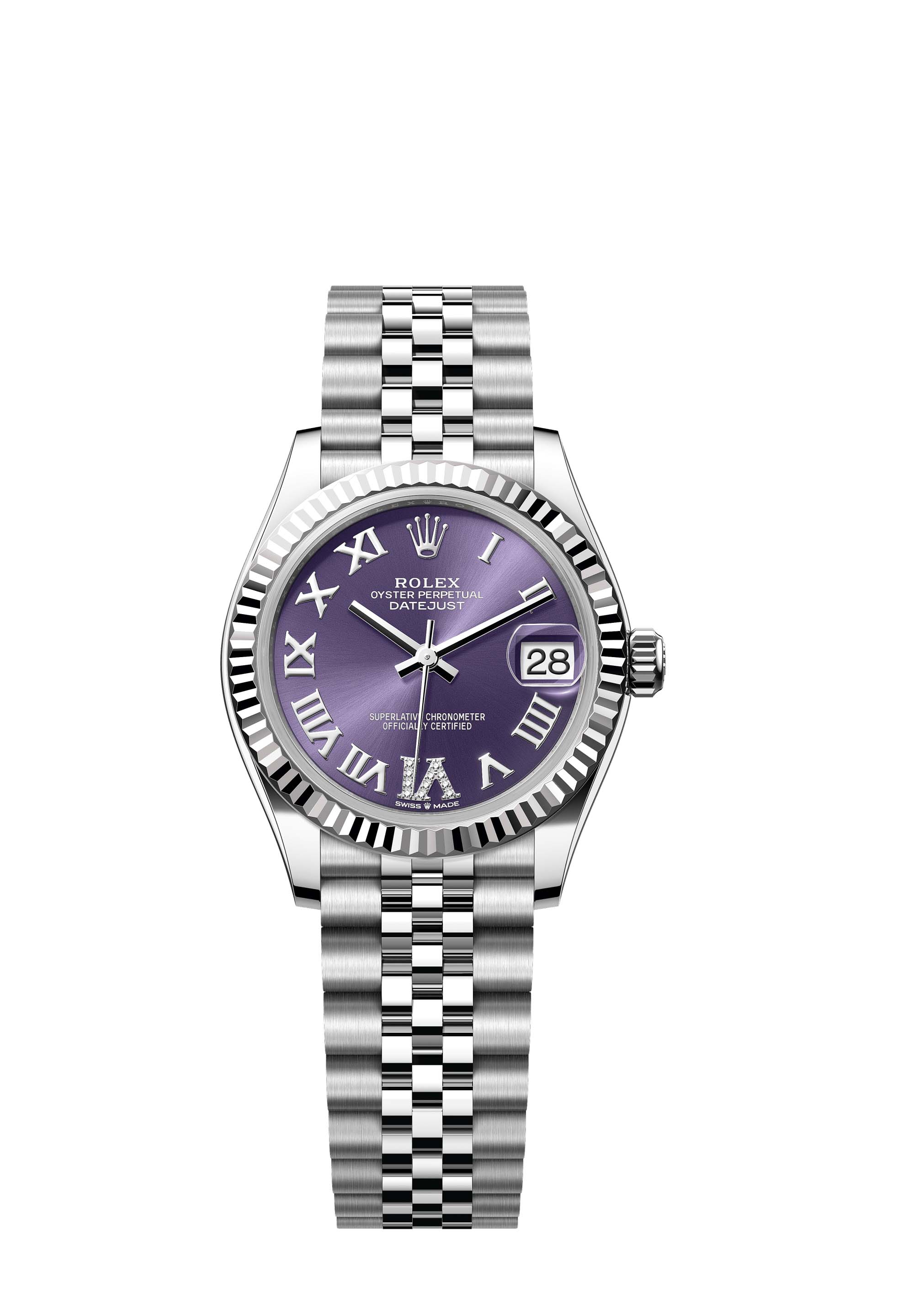 This Oyster Perpetual Datejust 31 in Oystersteel and white gold features an aubergine, diamond-set dial and a Jubilee bracelet.