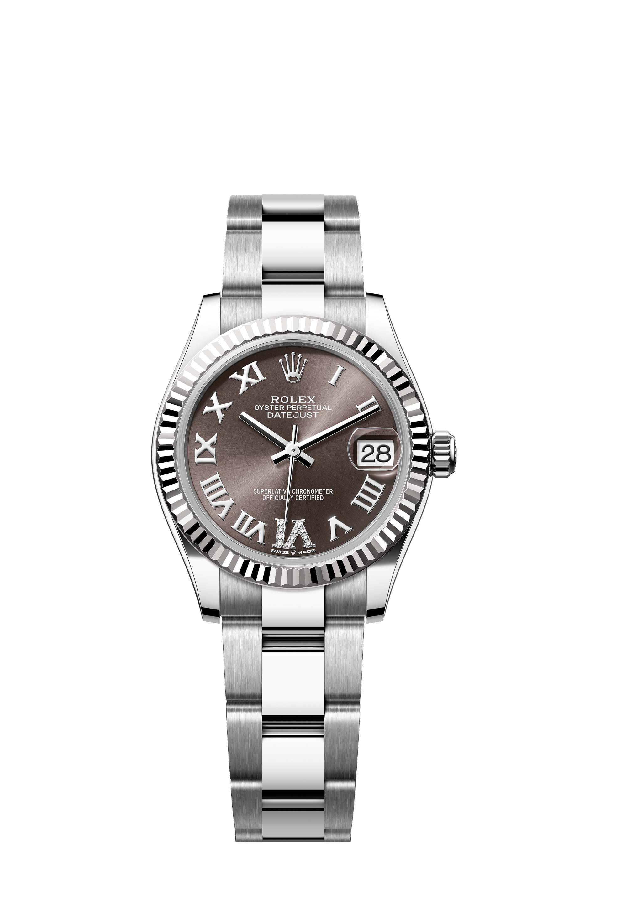 This Oyster Perpetual Datejust 31 in Oystersteel and white gold features a dark grey, diamond-set dial and an Oyster bracelet.