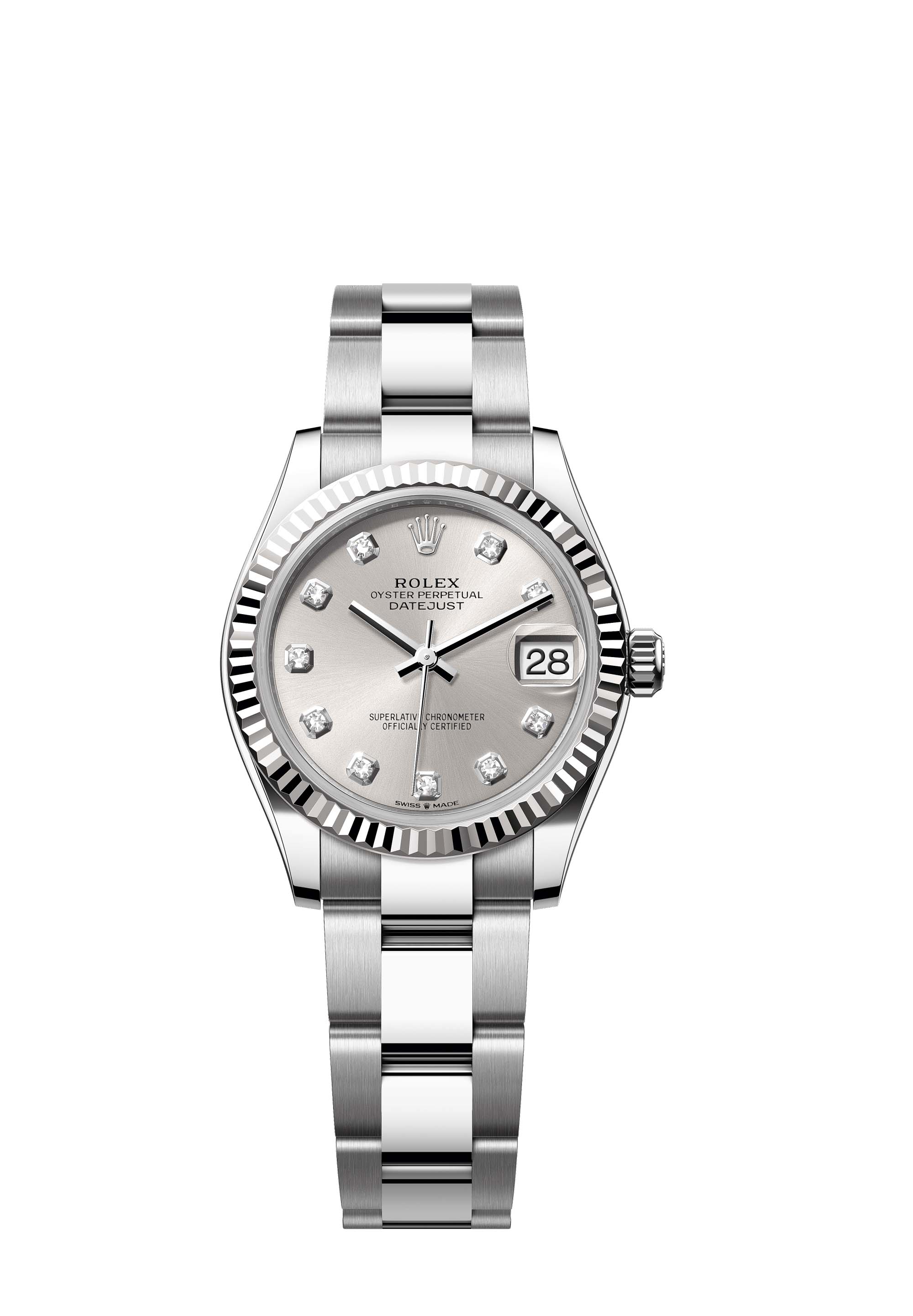 This Oyster Perpetual Datejust 31 in Oystersteel and white gold features a silver, diamond-set dial and an Oyster bracelet.
