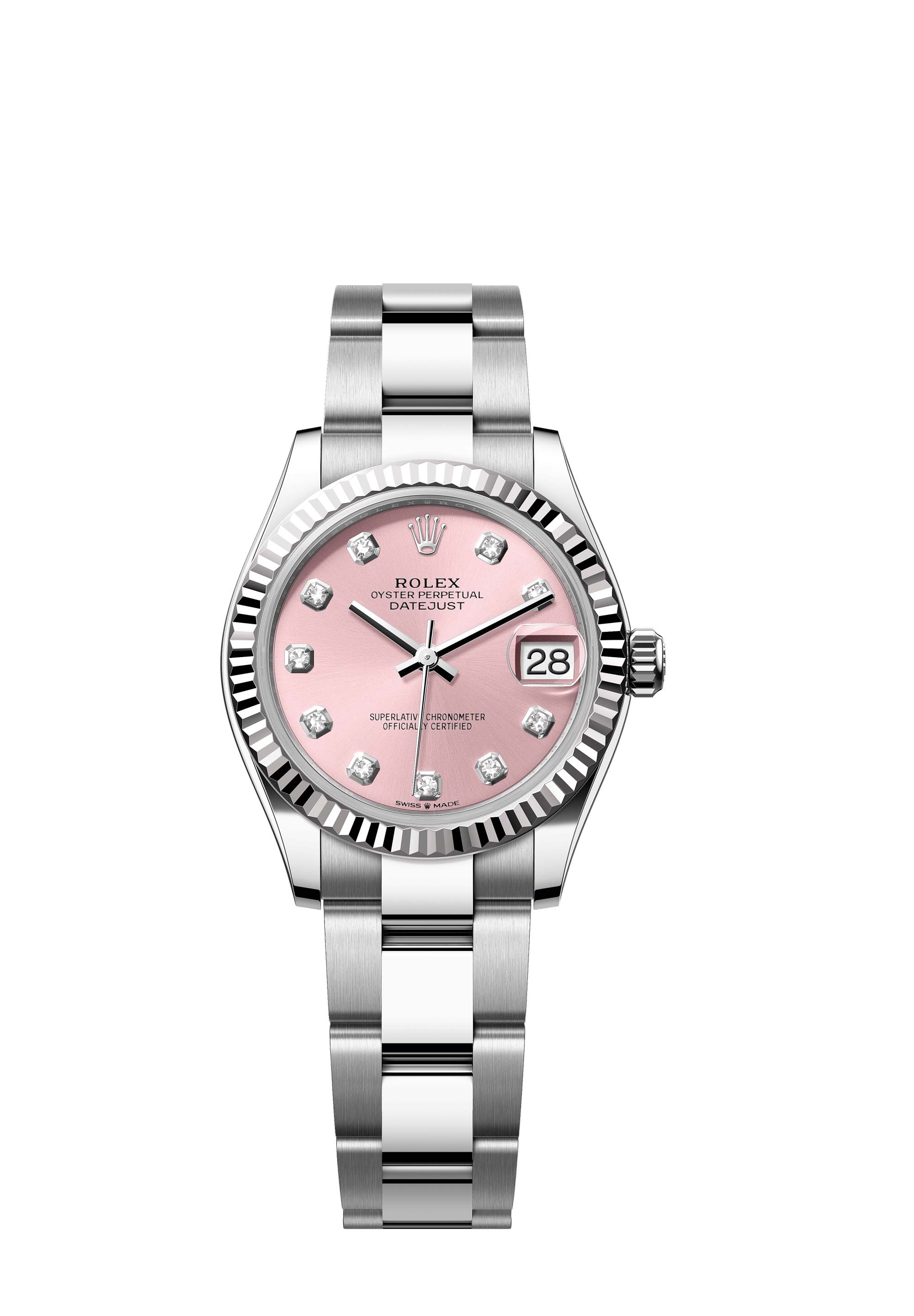 This Oyster Perpetual Datejust 31 in Oystersteel and white gold features a pink, diamond-set dial and an Oyster bracelet.