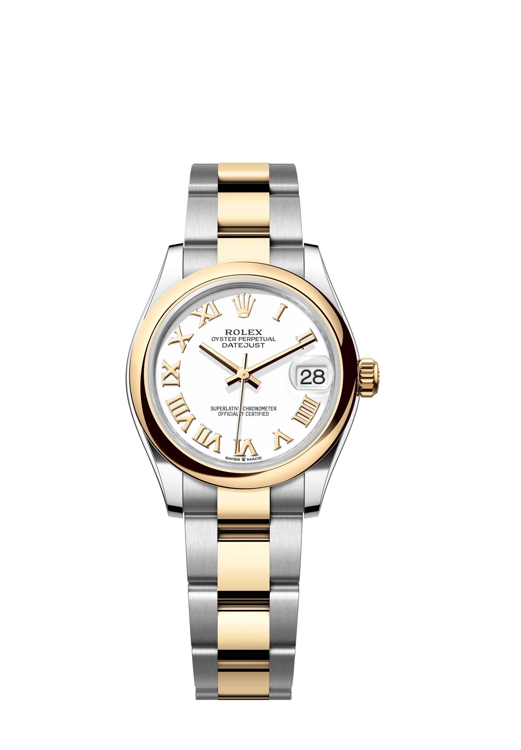 This Oyster Perpetual Datejust 31 in Oystersteel and yellow gold features a white dial and an Oyster bracelet.