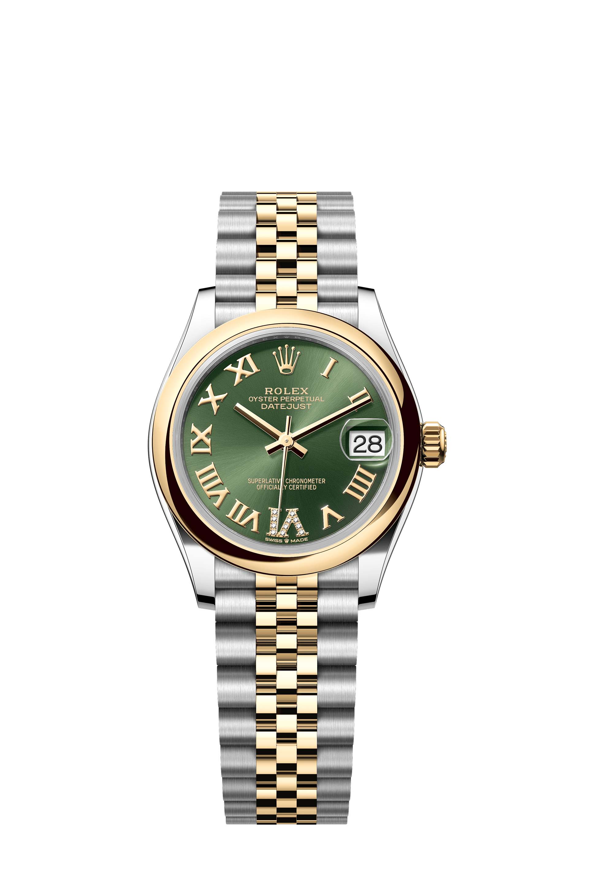 This Oyster Perpetual Datejust 31 in Oystersteel and yellow gold features an olive-green, diamond-set dial and a Jubilee bracelet.