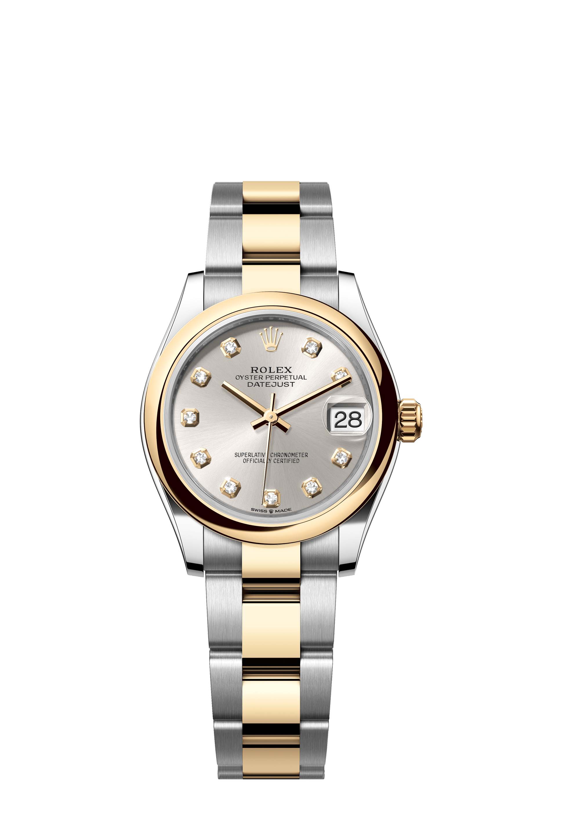 This Oyster Perpetual Datejust 31 in Oystersteel and yellow gold features a silver, diamond-set dial and an Oyster bracelet.