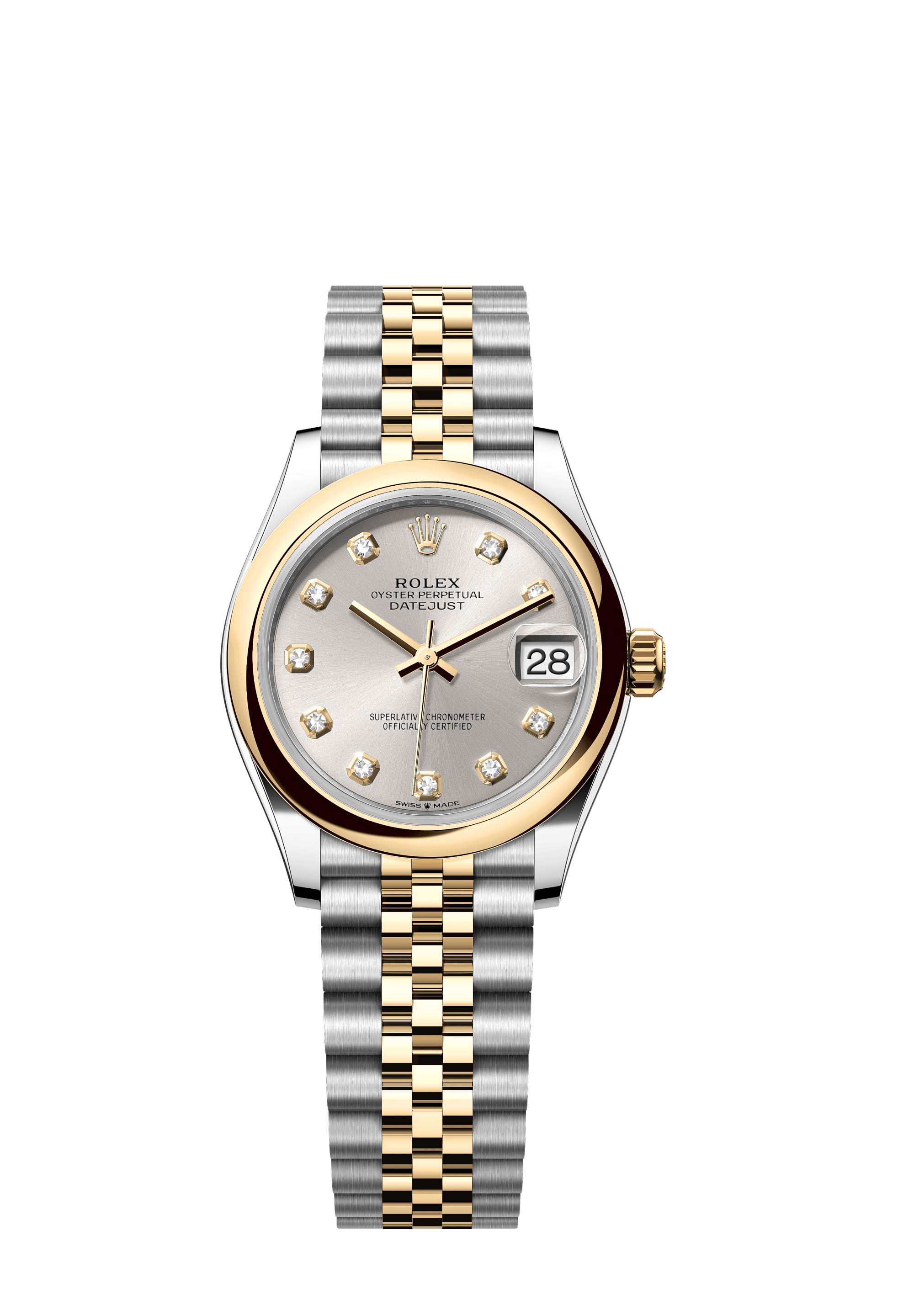 This Oyster Perpetual Datejust 31 in Oystersteel and yellow gold features a silver, diamond-set dial and a Jubilee bracelet.