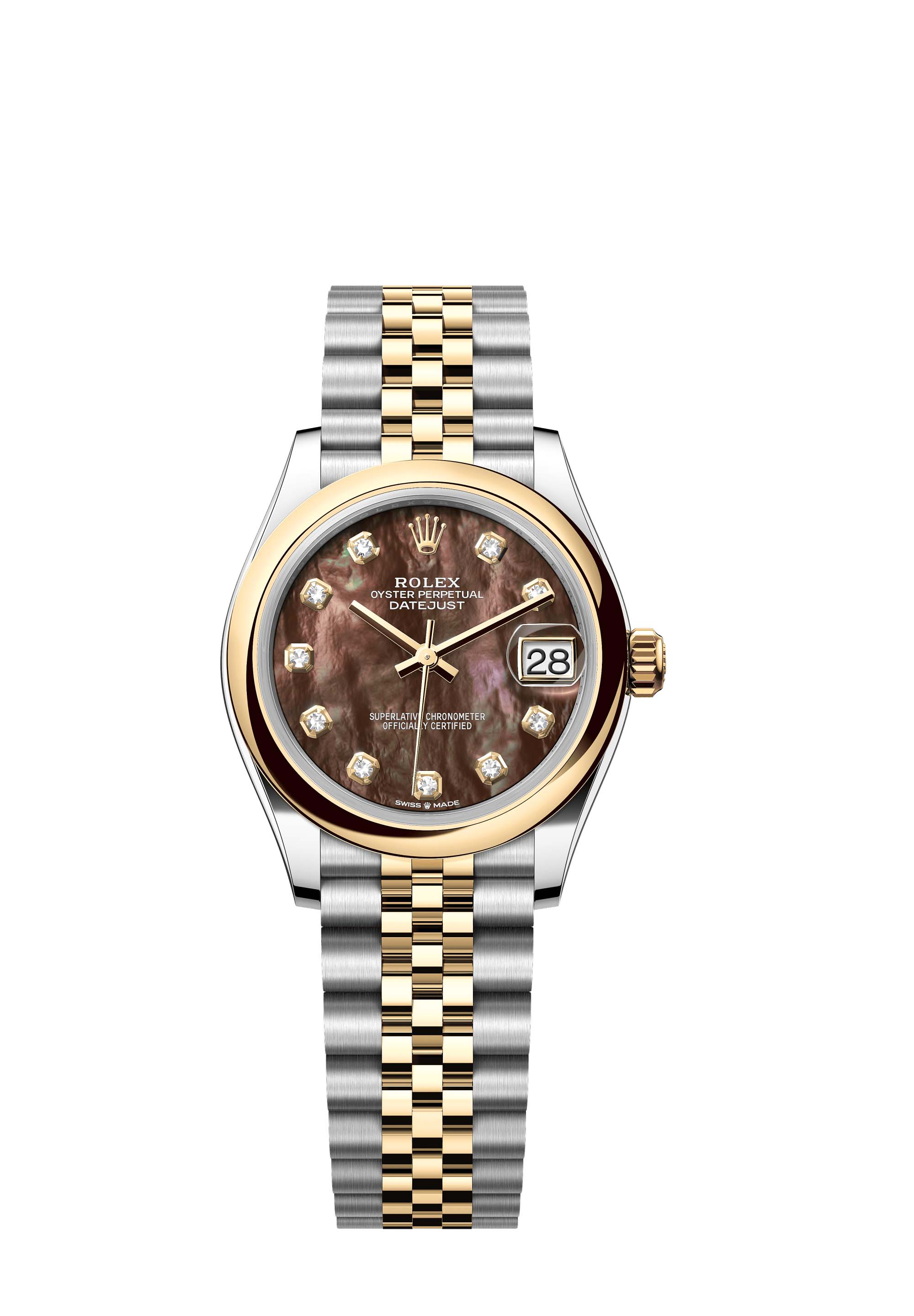 This Oyster Perpetual Datejust 31 in Oystersteel and yellow gold features a black mother-of-pearl, diamond-set dial and a Jubilee bracelet.