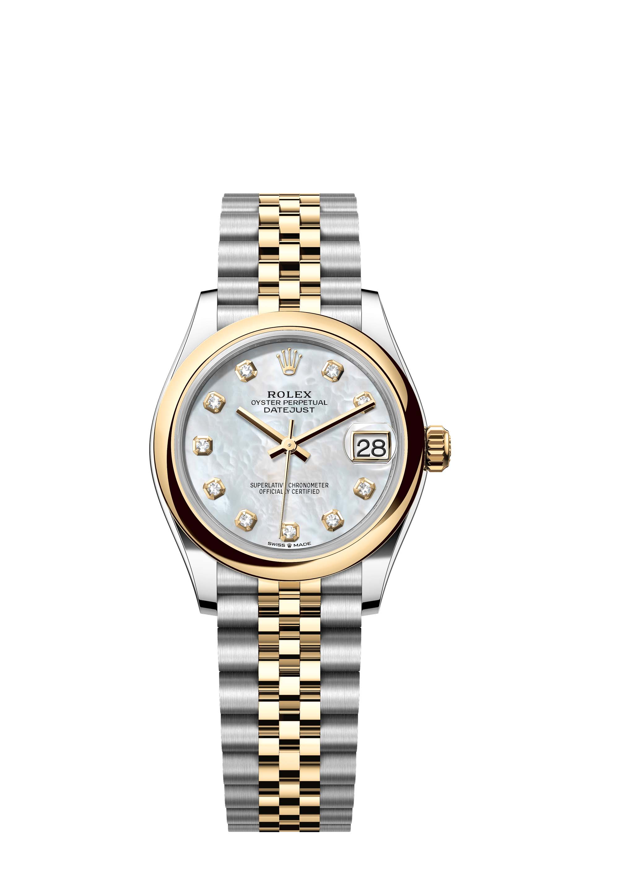 This Oyster Perpetual Datejust 31 in Oystersteel and yellow gold features a white mother-of-pearl, diamond-set dial and a Jubilee bracelet.