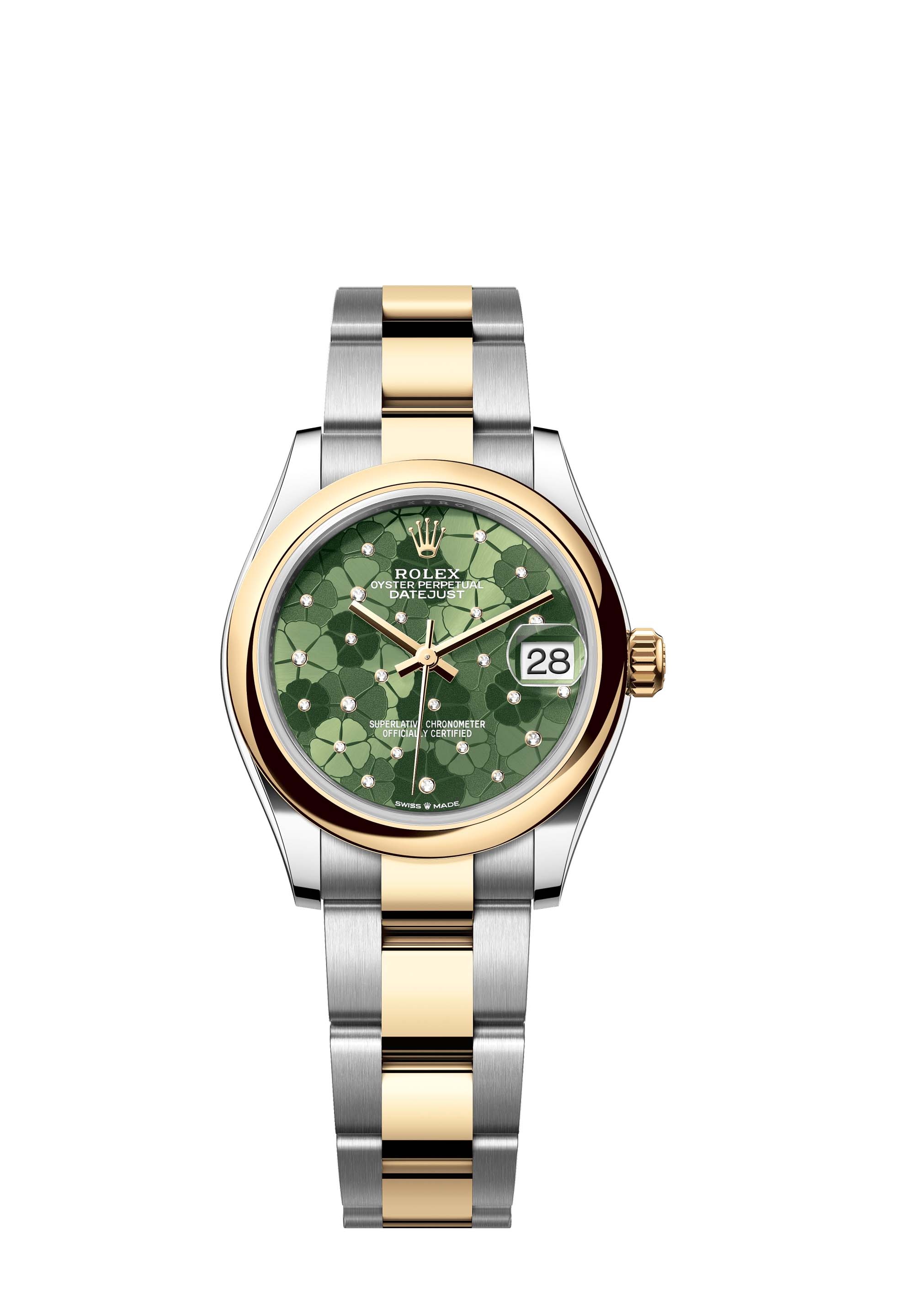 This Oyster Perpetual Datejust 31 in Oystersteel and yellow gold features an olive-green floral-motif, diamond-set dial and an Oyster bracelet.