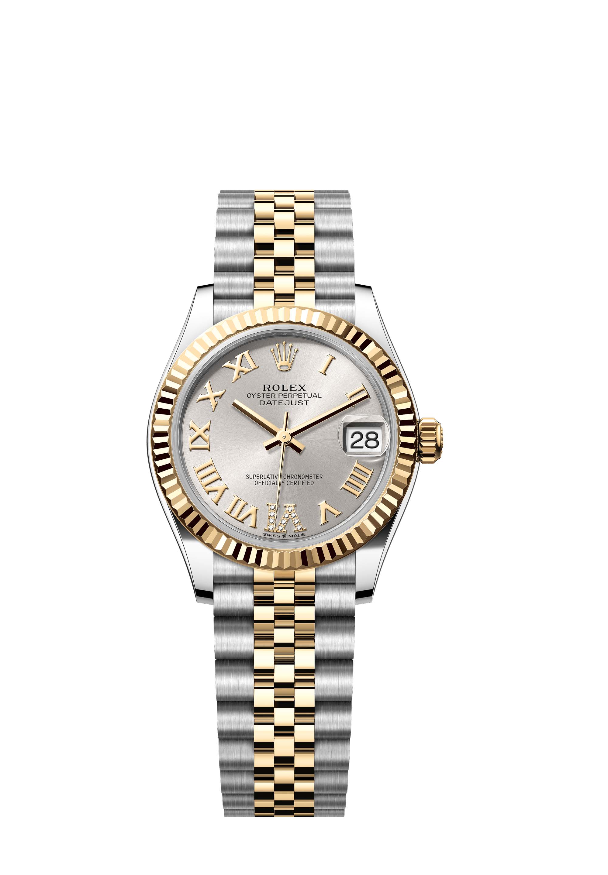 This Oyster Perpetual Datejust 31 in Oystersteel and yellow gold features a silver, diamond-set dial and a Jubilee bracelet.