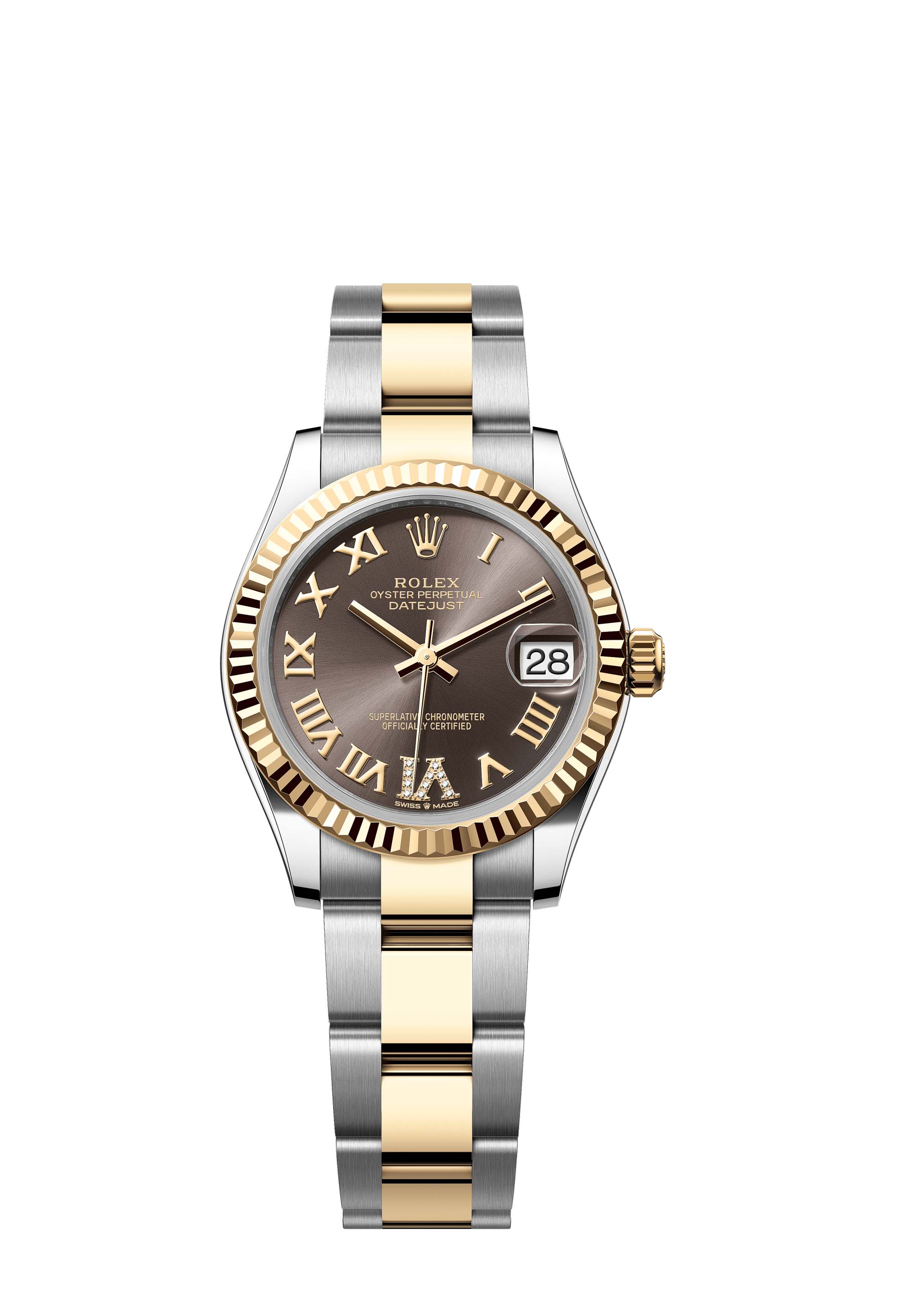 This Oyster Perpetual Datejust 31 in Oystersteel and yellow gold features a dark grey, diamond-set dial and an Oyster bracelet.