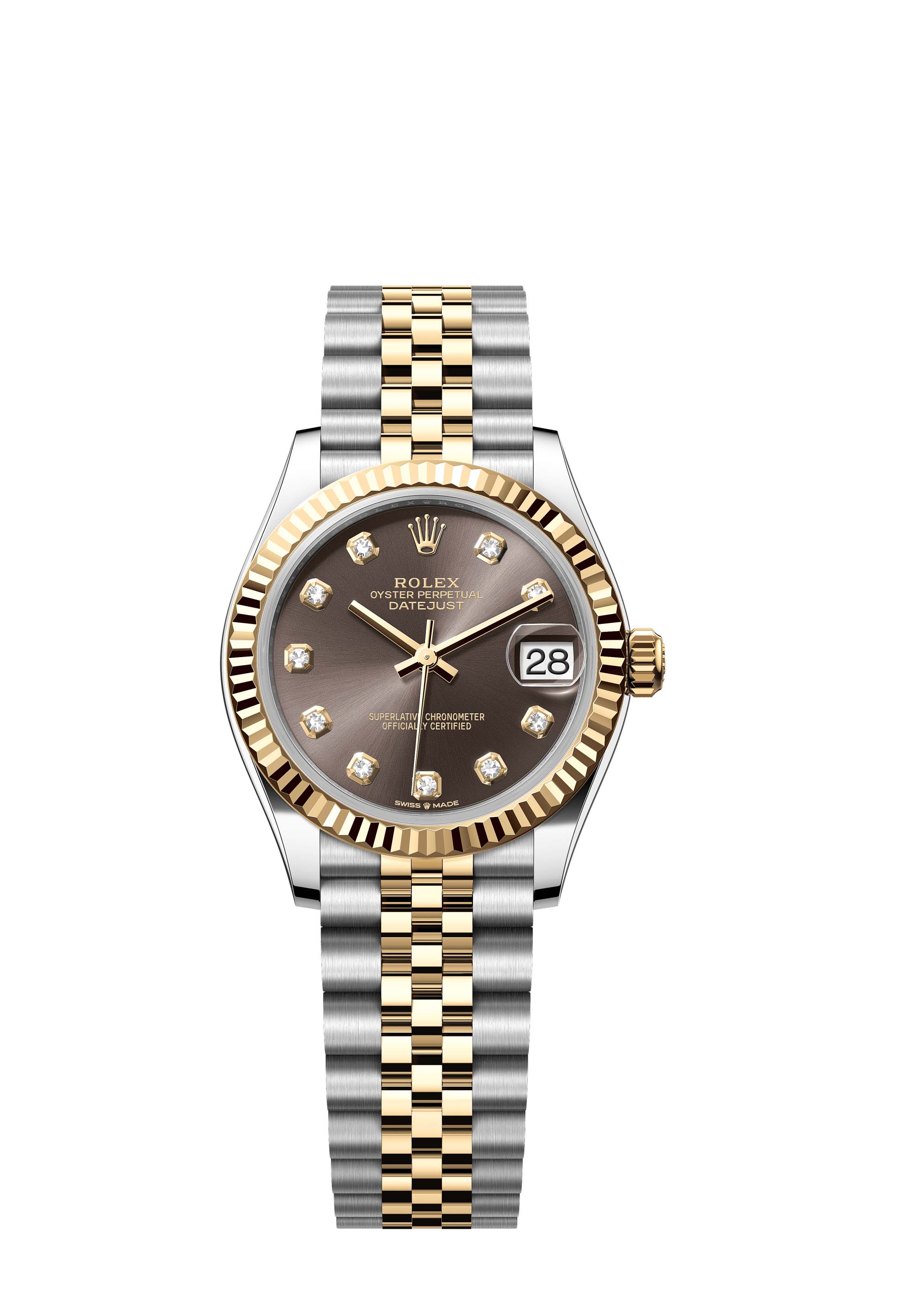 This Oyster Perpetual Datejust 31 in Oystersteel and yellow gold features a dark grey, diamond-set dial and a Jubilee bracelet.
