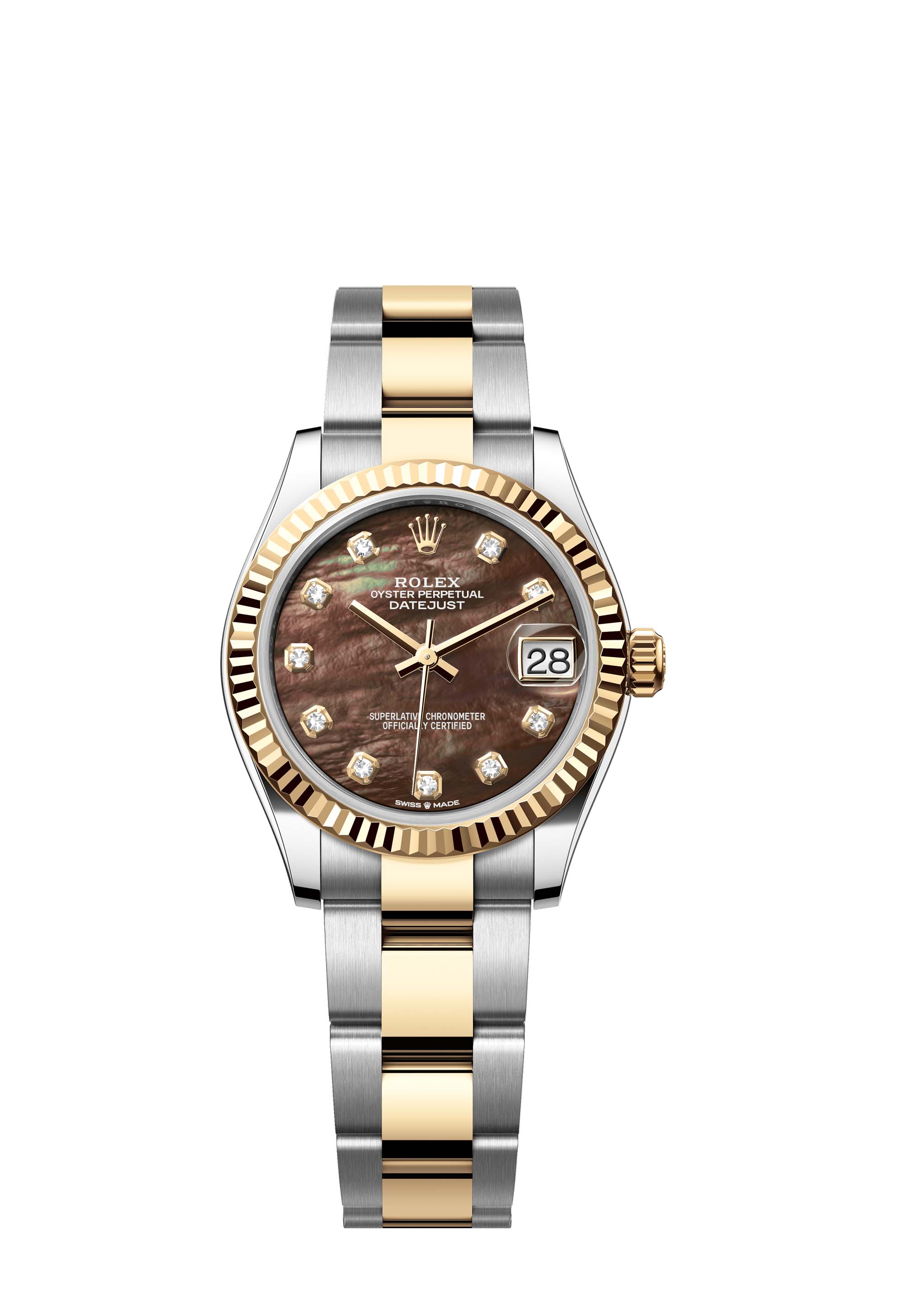 This Oyster Perpetual Datejust 31 in Oystersteel and yellow gold features a black mother-of-pearl, diamond-set dial and an Oyster bracelet.