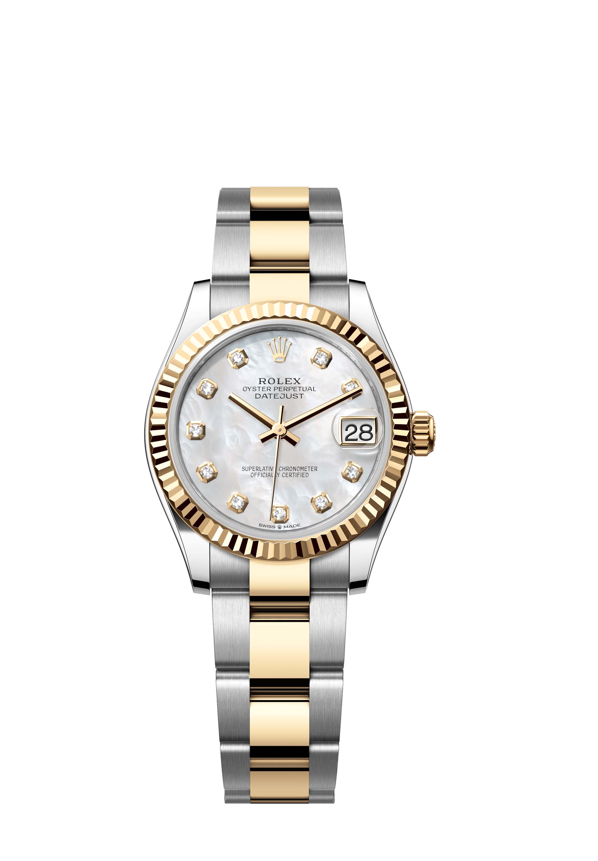 This Oyster Perpetual Datejust 31 in Oystersteel and yellow gold features a white mother-of-pearl, diamond-set dial and an Oyster bracelet.