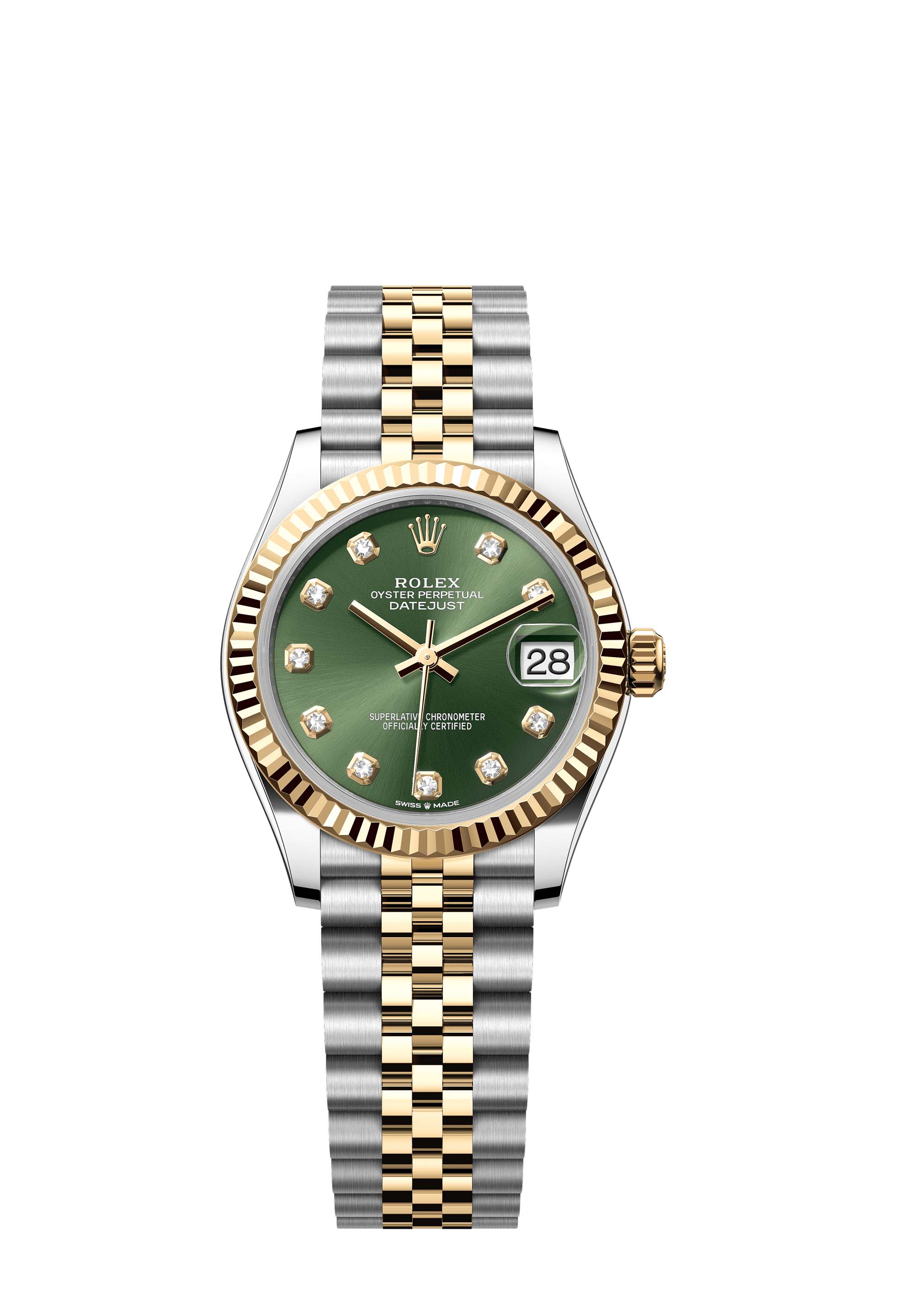 This Oyster Perpetual Datejust 31 in Oystersteel and yellow gold features an olive-green, diamond-set dial and a Jubilee bracelet.