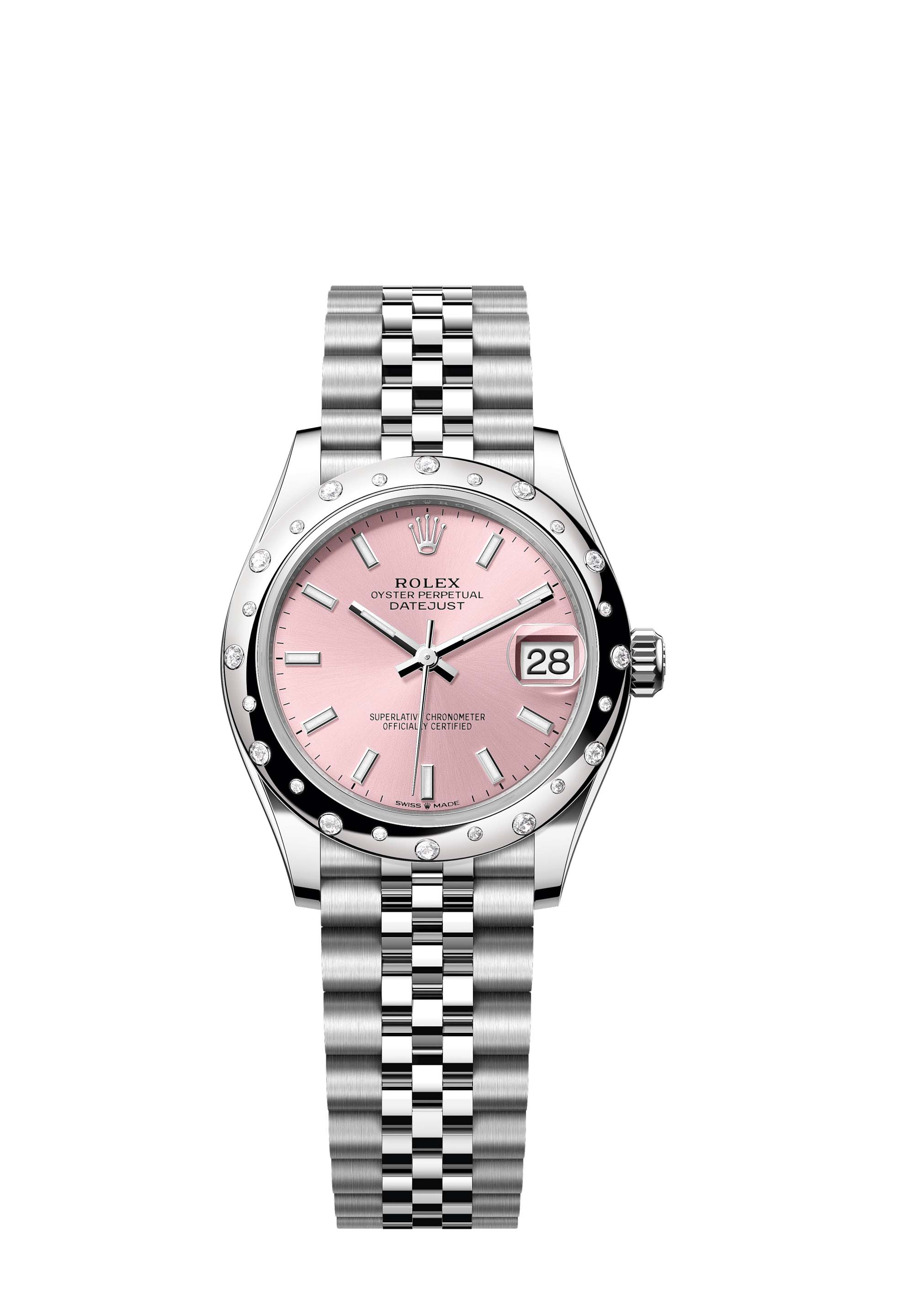 This Oyster Perpetual Datejust 31 in Oystersteel and white gold features a pink dial and a Jubilee bracelet.