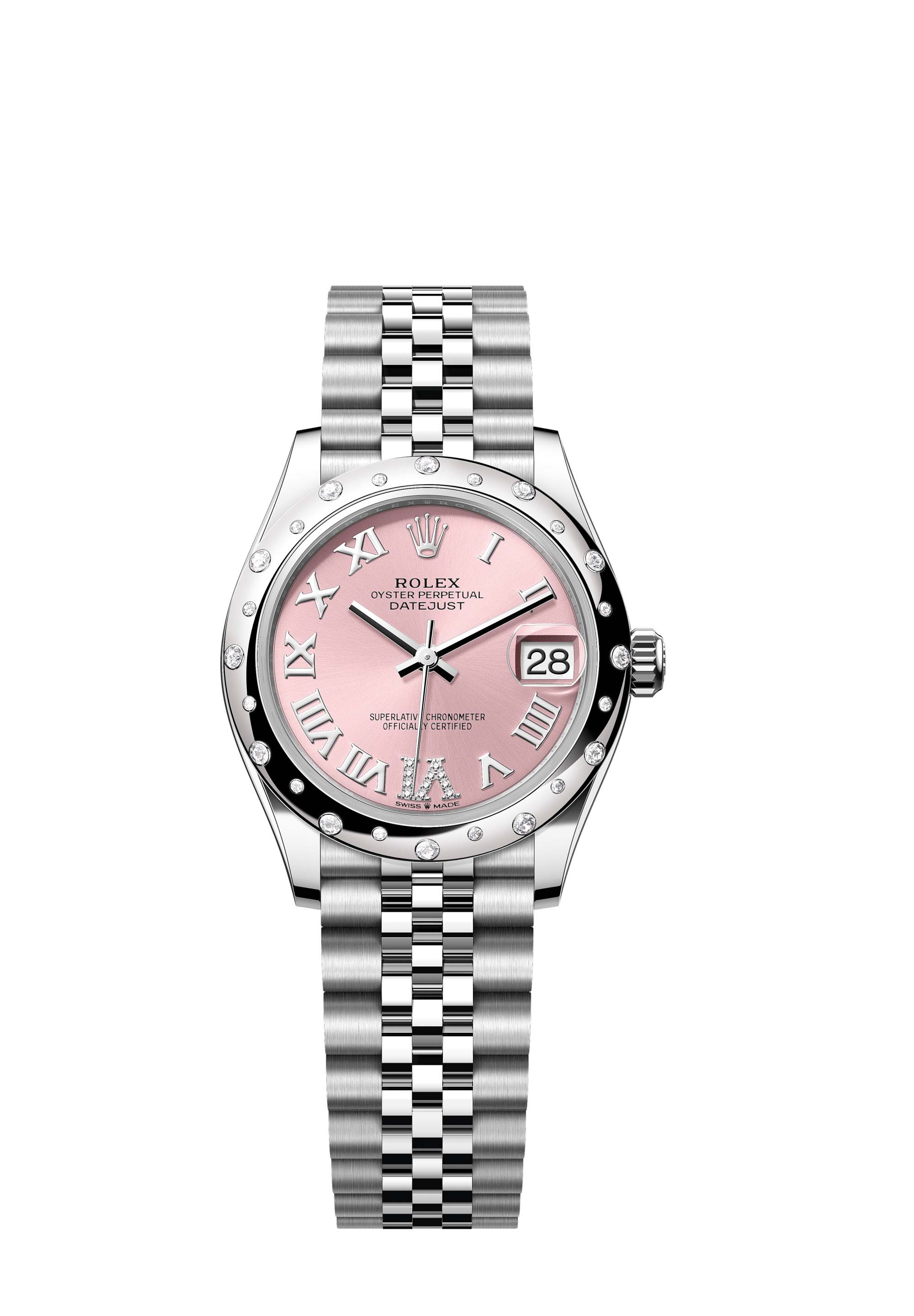 This Oyster Perpetual Datejust 31 in Oystersteel and white gold features a pink, diamond-set dial and a Jubilee bracelet.