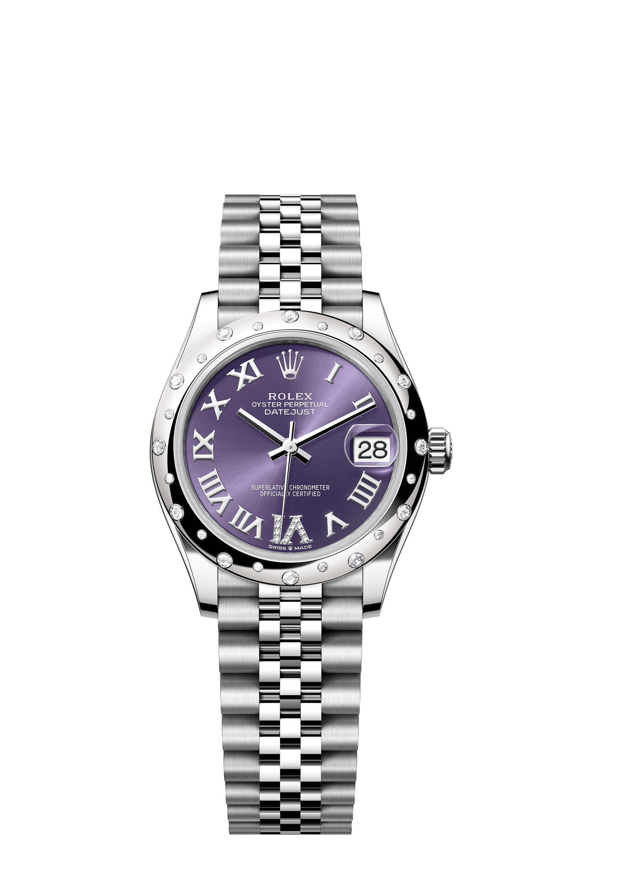 This Oyster Perpetual Datejust 31 in Oystersteel and white gold features an aubergine, diamond-set dial and a Jubilee bracelet.