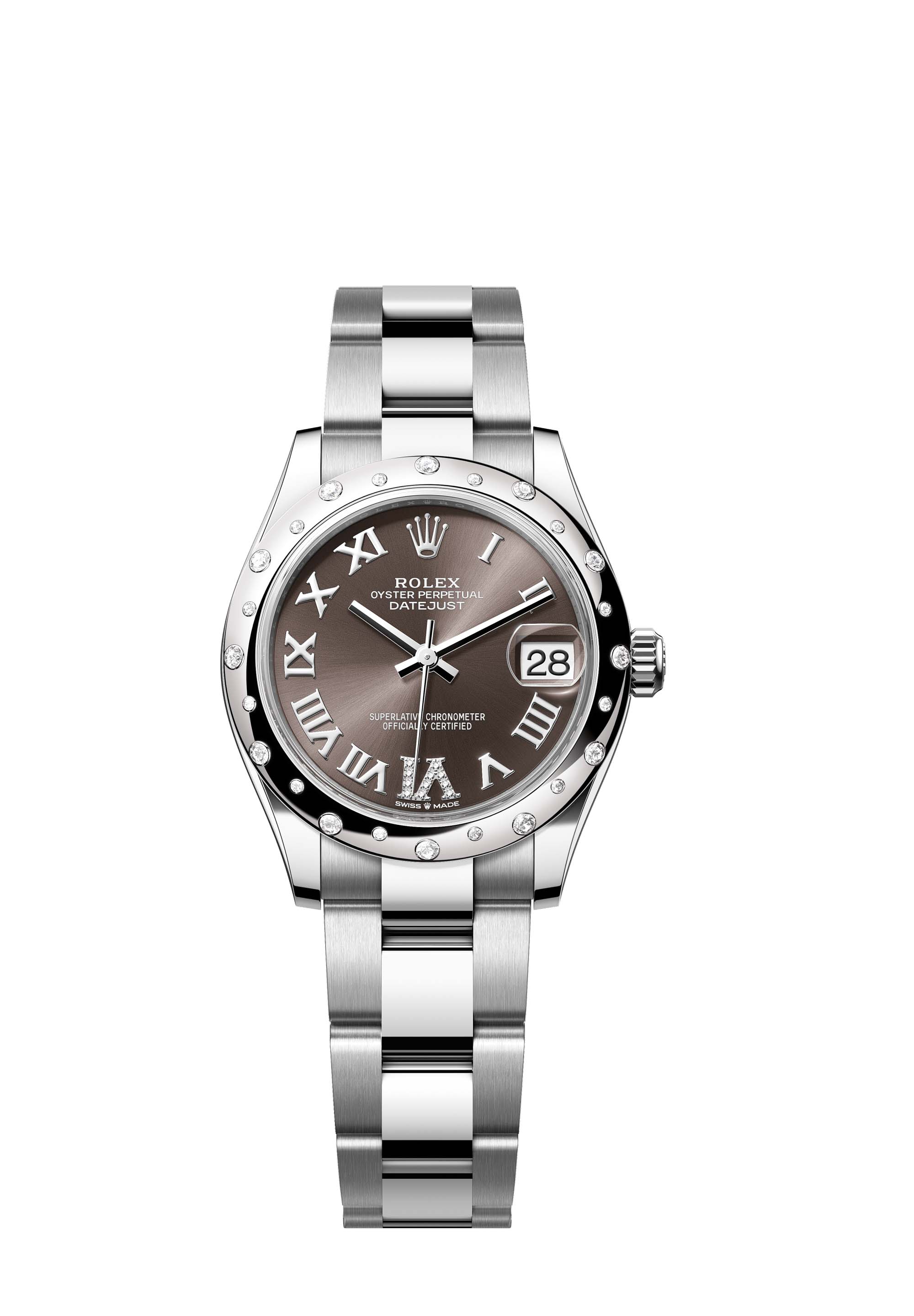 This Oyster Perpetual Datejust 31 in Oystersteel and white gold features a dark grey, diamond-set dial and an Oyster bracelet.