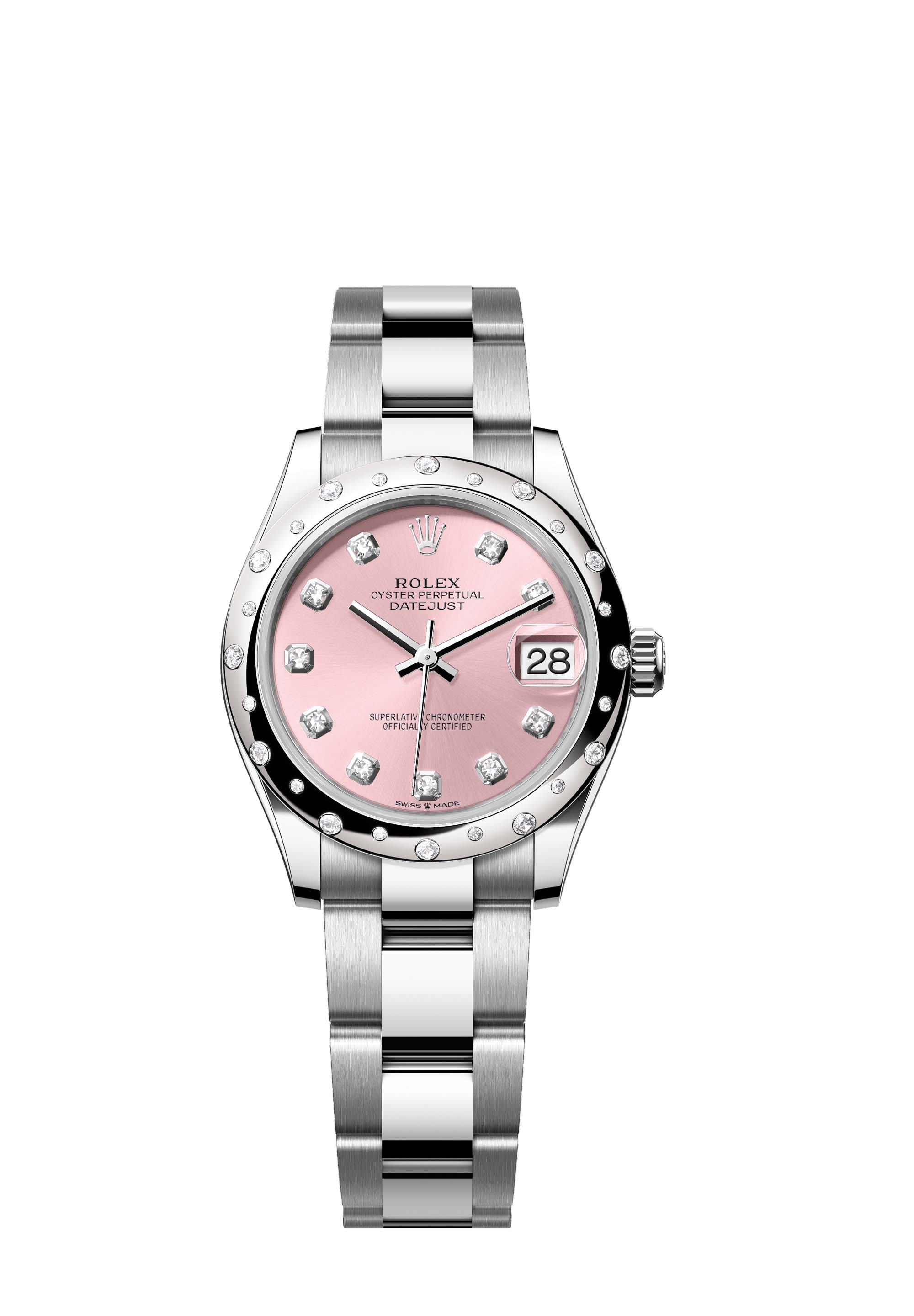 This Oyster Perpetual Datejust 31 in Oystersteel and white gold features a pink, diamond-set dial and an Oyster bracelet.