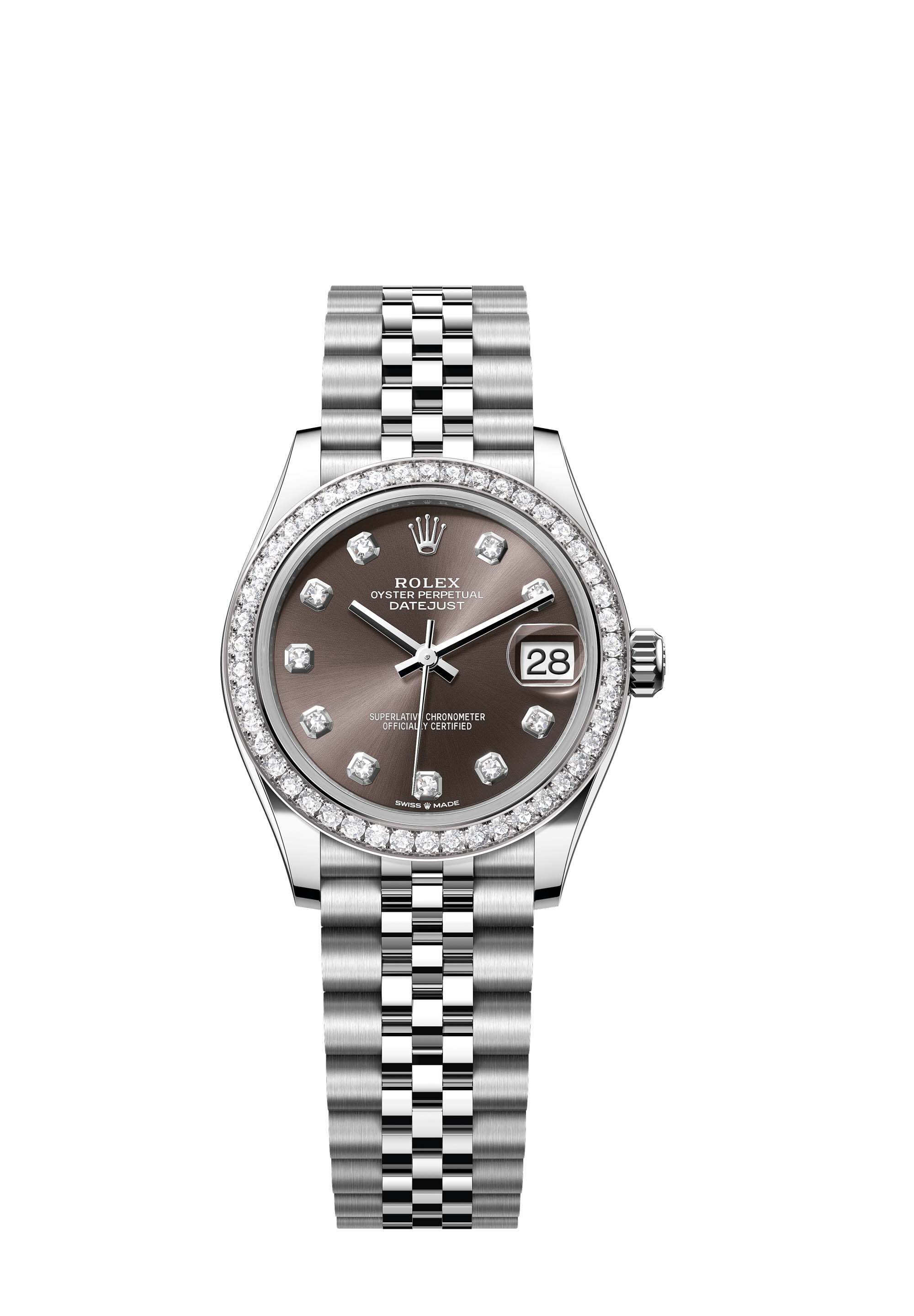 This Oyster Perpetual Datejust 31 in Oystersteel and white gold features a dark grey, diamond-set dial and a Jubilee bracelet.