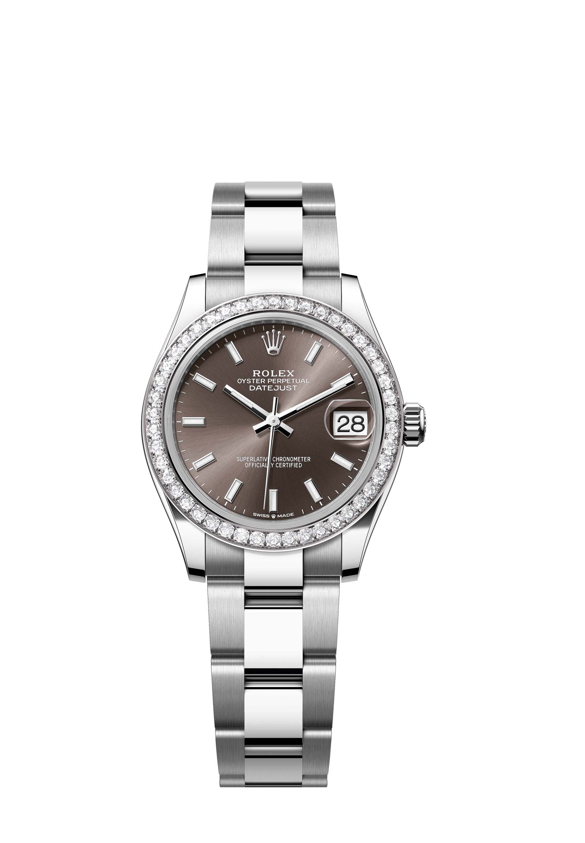 This Oyster Perpetual Datejust 31 in Oystersteel and white gold features a dark grey dial and an Oyster bracelet.