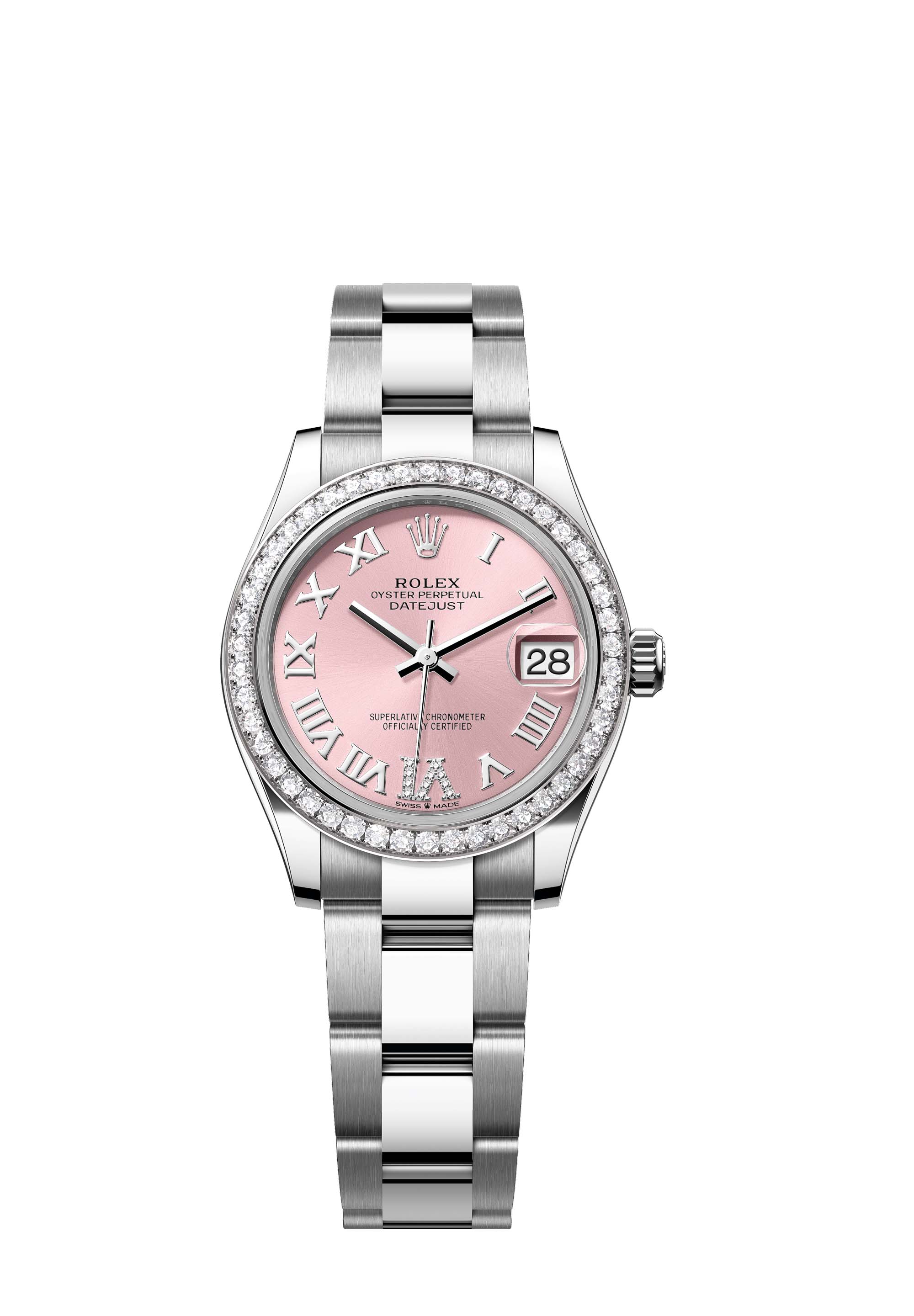 This Oyster Perpetual Datejust 31 in Oystersteel and white gold features a pink, diamond-set dial and an Oyster bracelet.