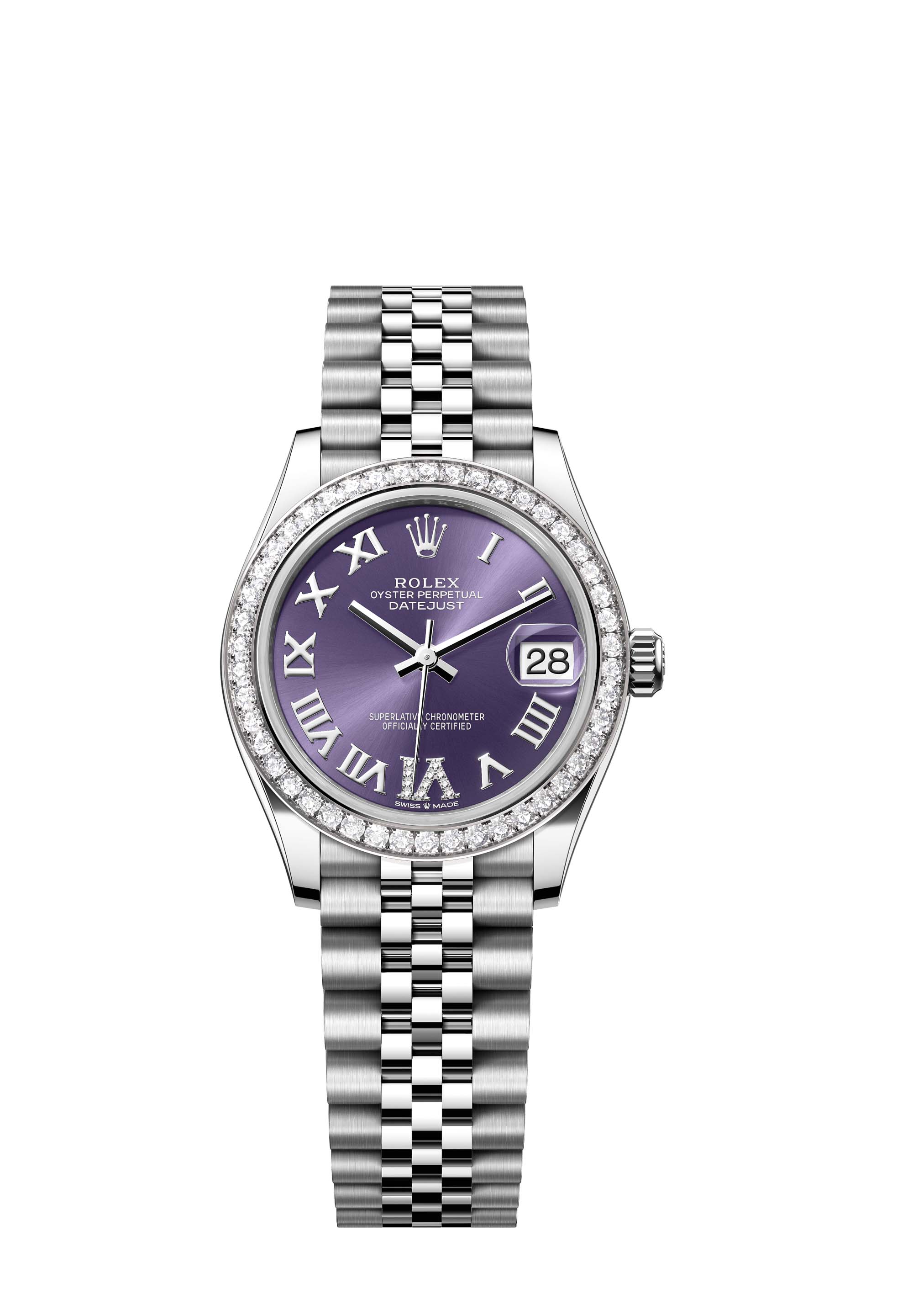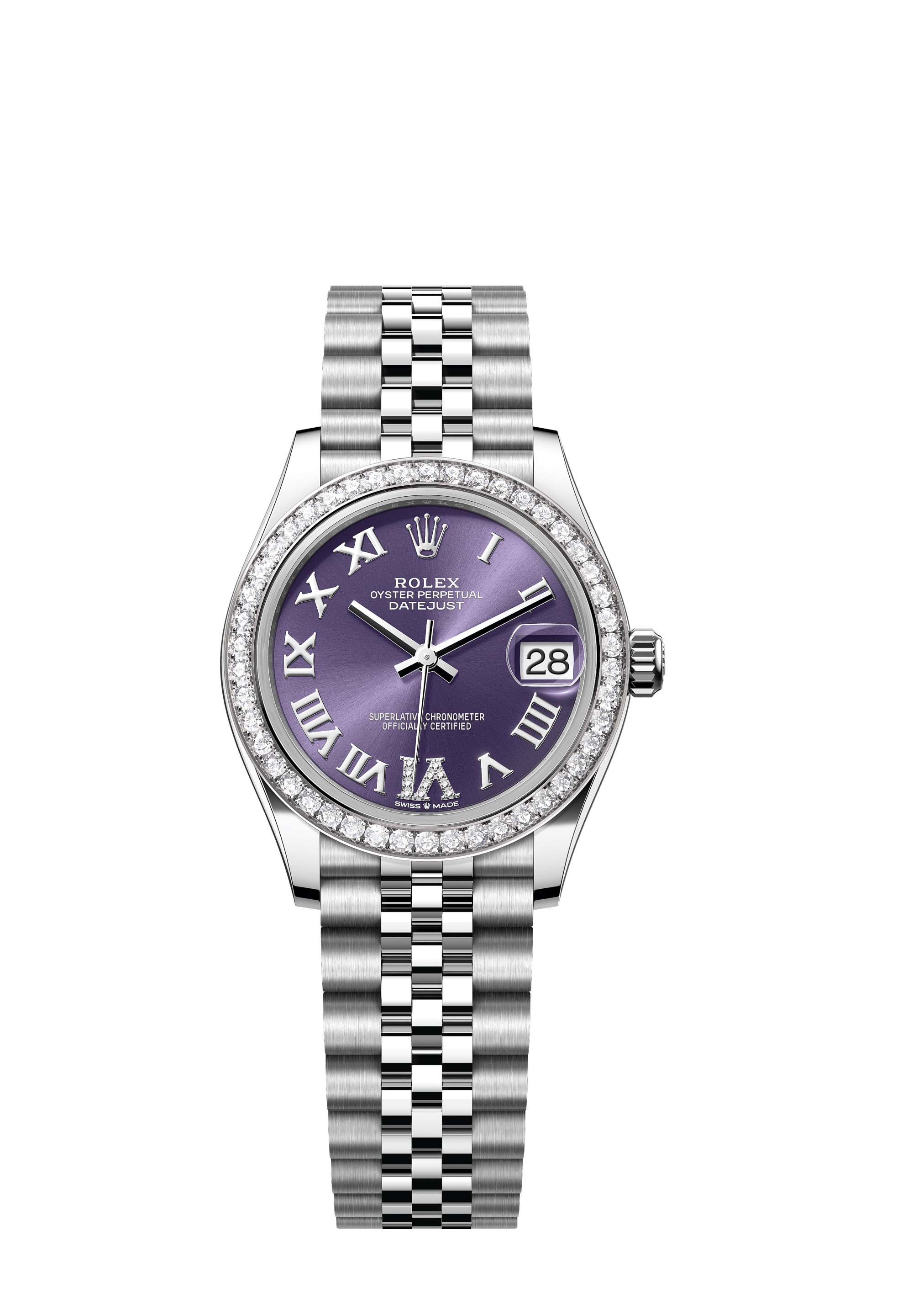 This Oyster Perpetual Datejust 31 in Oystersteel and white gold features an aubergine, diamond-set dial and a Jubilee bracelet.