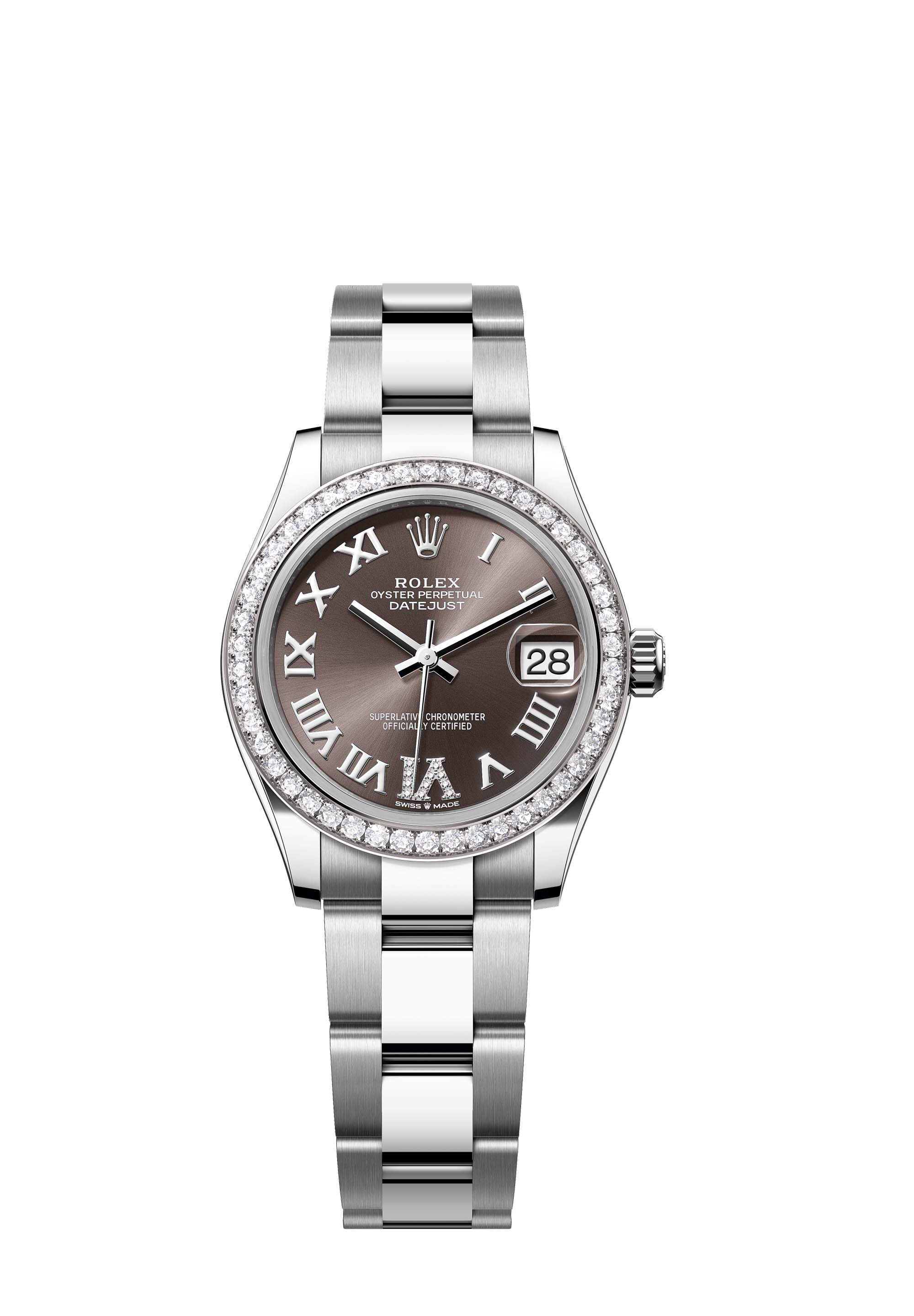 This Oyster Perpetual Datejust 31 in Oystersteel and white gold features a dark grey, diamond-set dial and an Oyster bracelet.