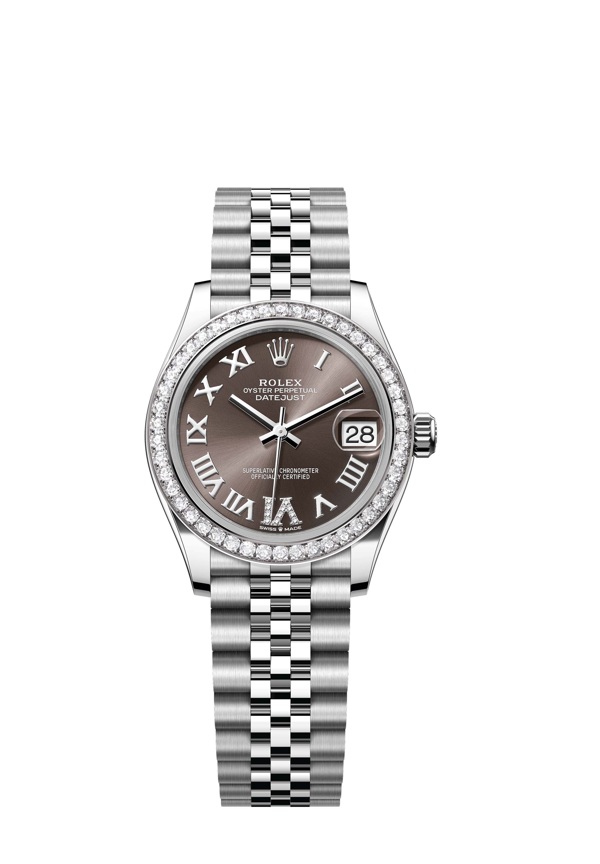 This Oyster Perpetual Datejust 31 in Oystersteel and white gold features a dark grey, diamond-set dial and a Jubilee bracelet.