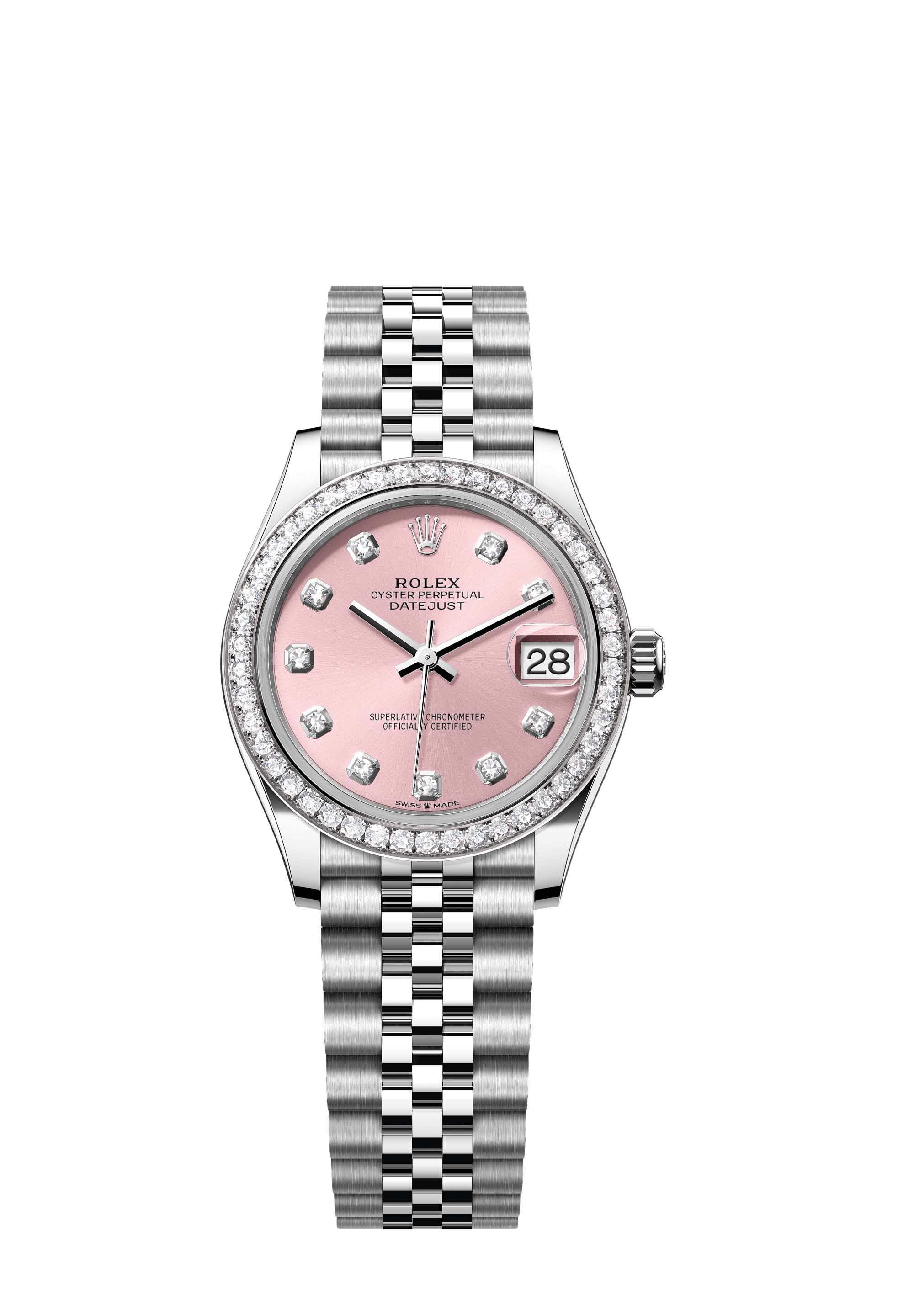 This Oyster Perpetual Datejust 31 in Oystersteel and white gold features a pink, diamond-set dial and a Jubilee bracelet.